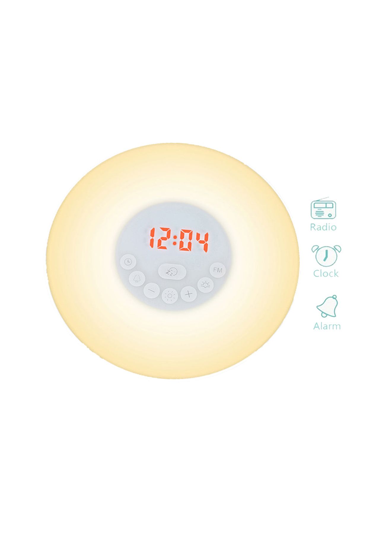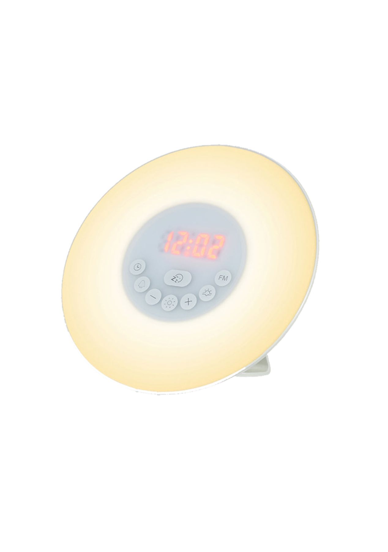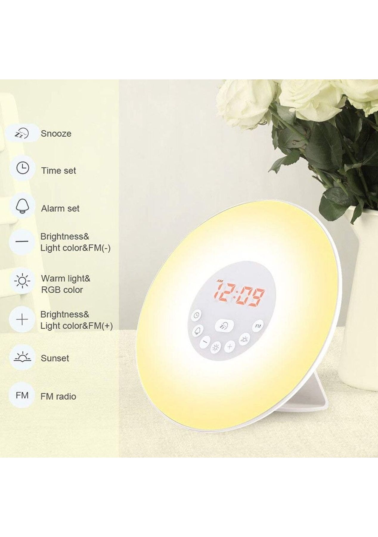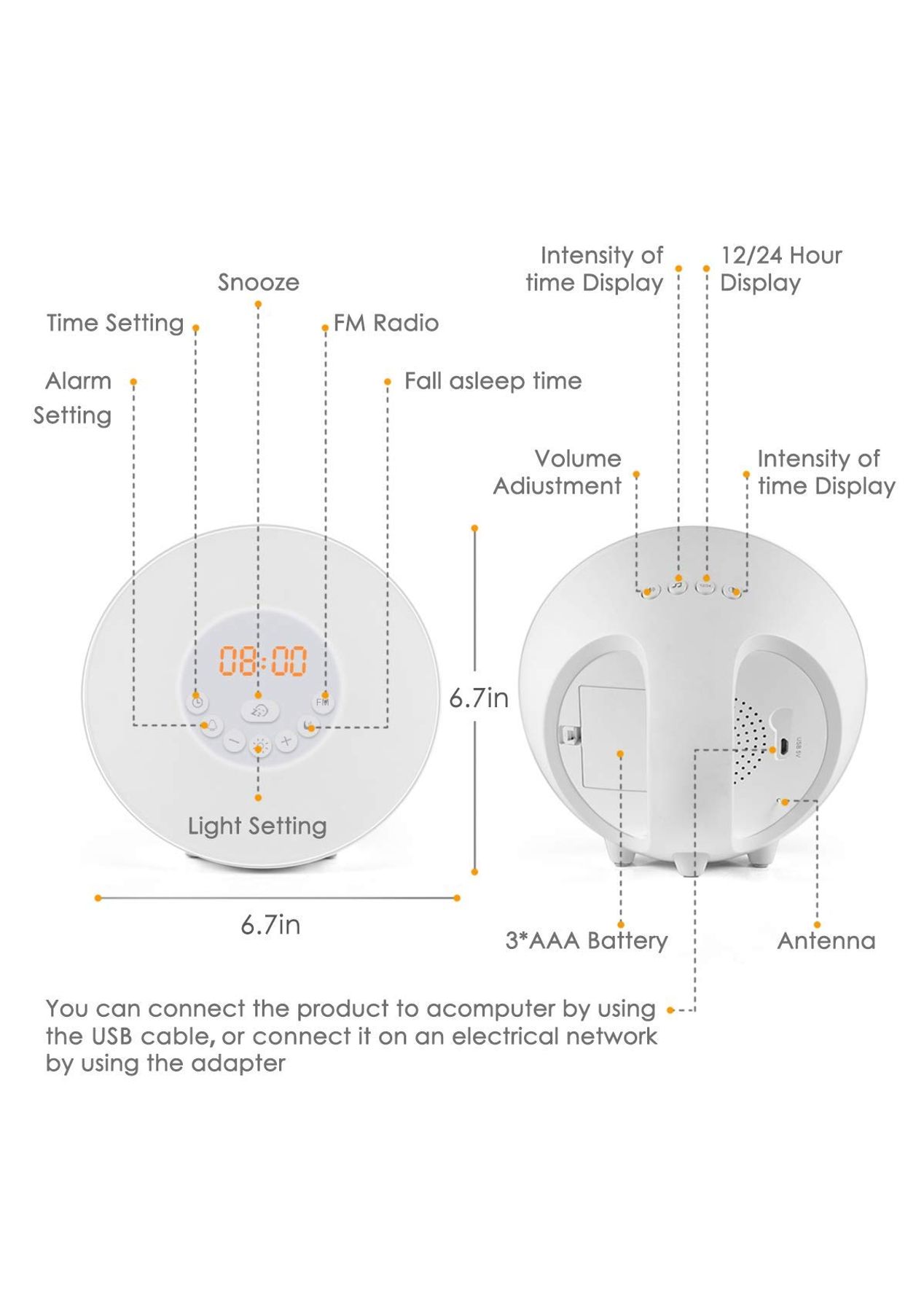 Product Description: Sunrise & Sunset Simulation:? This product simulates sunrise 30mins before the alarm time. The light will slowly turn from 10% brightness and increase smoothly to 100% within 30 minutes. It lets you wake up naturally, giving you full of energy all day. Also, it simulates the sunset mode. It gradually dims 30mins before your set time to help you fall asleep *7 Colors & Adjustable brightness: This product has 7 colors LED mood light, creates fascinating atmosphere with 10 adjustable brightness settings. *Snooze function: Gently press the snooze button to directly enter the snooze mode, 5 minutes later gently playing music again to wake you up and last for 2 minutes! Easy to operate it! *FM Radio function: Long press the FM button to enter the search radio channel mode, the searched channel will be saved automatically. Besides, you also could set FM Radio as the 7th sound. *Six natural sounds: This wake-up light Alarm clock offers 6 kinds of natural sounds (piano, violin, bagpipes, waves, birds, and "DiDi"), which makes you feel like waking up in Nature. Feel the breath of nature ? Specifications: Input: AC 100-240V, 50/60Hz 0.2A Output: DC 5V 1A Color: White Material: ABS + PC LED Quantity: 9*Warm White LEDs + 9*RGB LEDs Power Supply: 2 * AAA Batteries(NOT Included); USB power supplyNote:?When there is only battery, you can only set and backup time, other functions cannot be used. Product Size: 170 * 170 * 104mm Product Weight: 217g size£º20*20*13cm weight£º480g Package Inclusion: *1x LED Wake- Up Lights*1x USB Power Cable *1x user manual