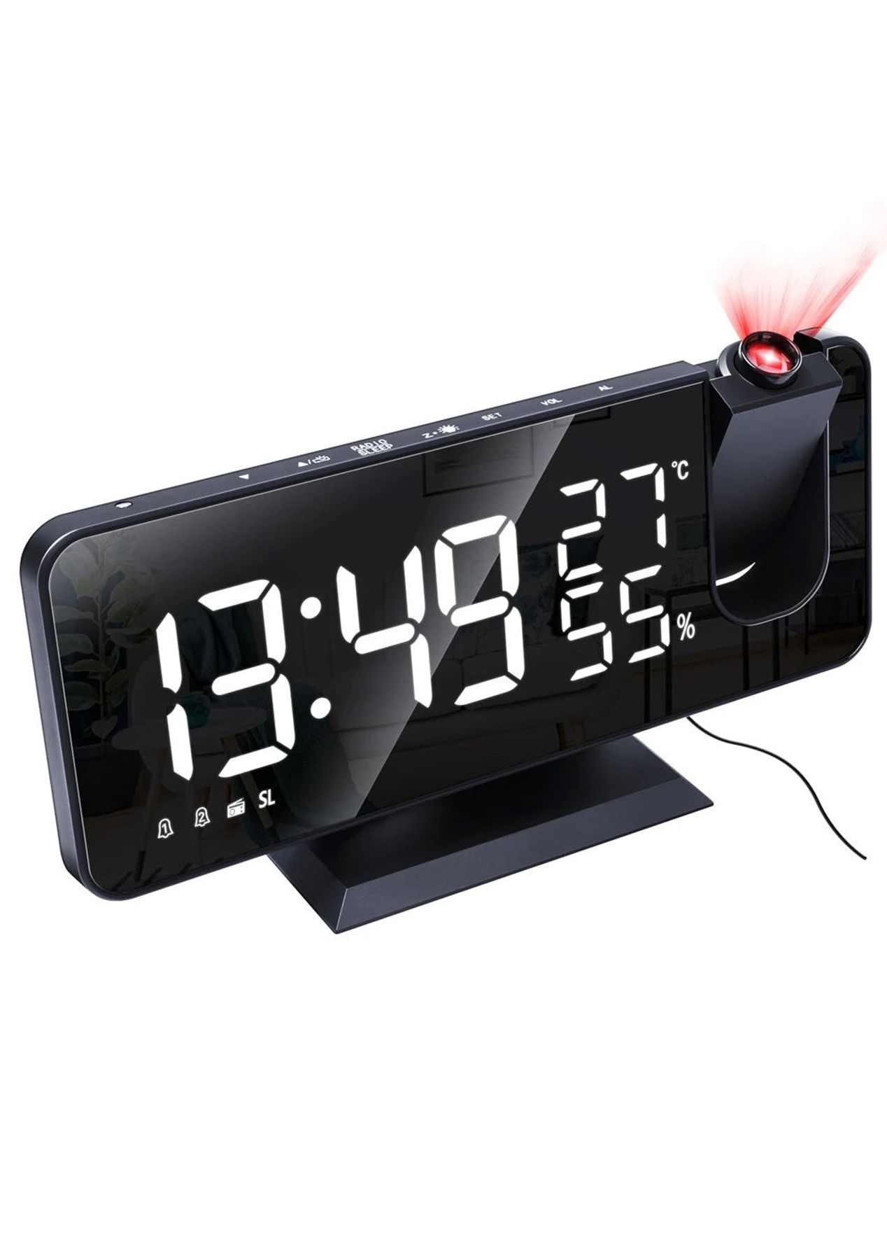 Product Description: This digital projection clock offers ultra-clear views of the time on your ceiling/wall with an enhanced adjustable 180 rotating projector, rotating the focus ring at the appropriate distance of 5m, making it easy to catch the time while you are in your bed without touching anything.This digital alarm clock is more than an alarm clock, but also an FM radio, it can store, scan, and lock your favorite radio station from 76.0 to 108.0 MHz, meeting the different radio standards of different countries. This digital alarm clock can be set two separate alarms for couples with different routines or a backup to wake up heavy sleepers. The alarm lasts for about 2 minutes and pressing the snooze button will give you another 5 minutes of sleep time. The brightness of the time display can be adjusted for 4 levels which can not only save power but also emit soft light for sleeping.The clock has a temperature display, with a temperature measurement range: 0¬°√¶~50¬°√¶ Error: plus, or minus 1¬°√¶ as well as a humidity display, with a humidity measurement range: 20%~95% error: plus, or minus 5%?Product Specification:Color: Black and Blue, Black and White, White and WhiteMaterial: ABSSize: 185*45*91mmWeight: 250gFunctions: LED Alarm ClockPower Supply: USB Cable Plugged-in?Package Inclusion:1 * LED Alarm Clock1 * Power Cable 1 * User Manual