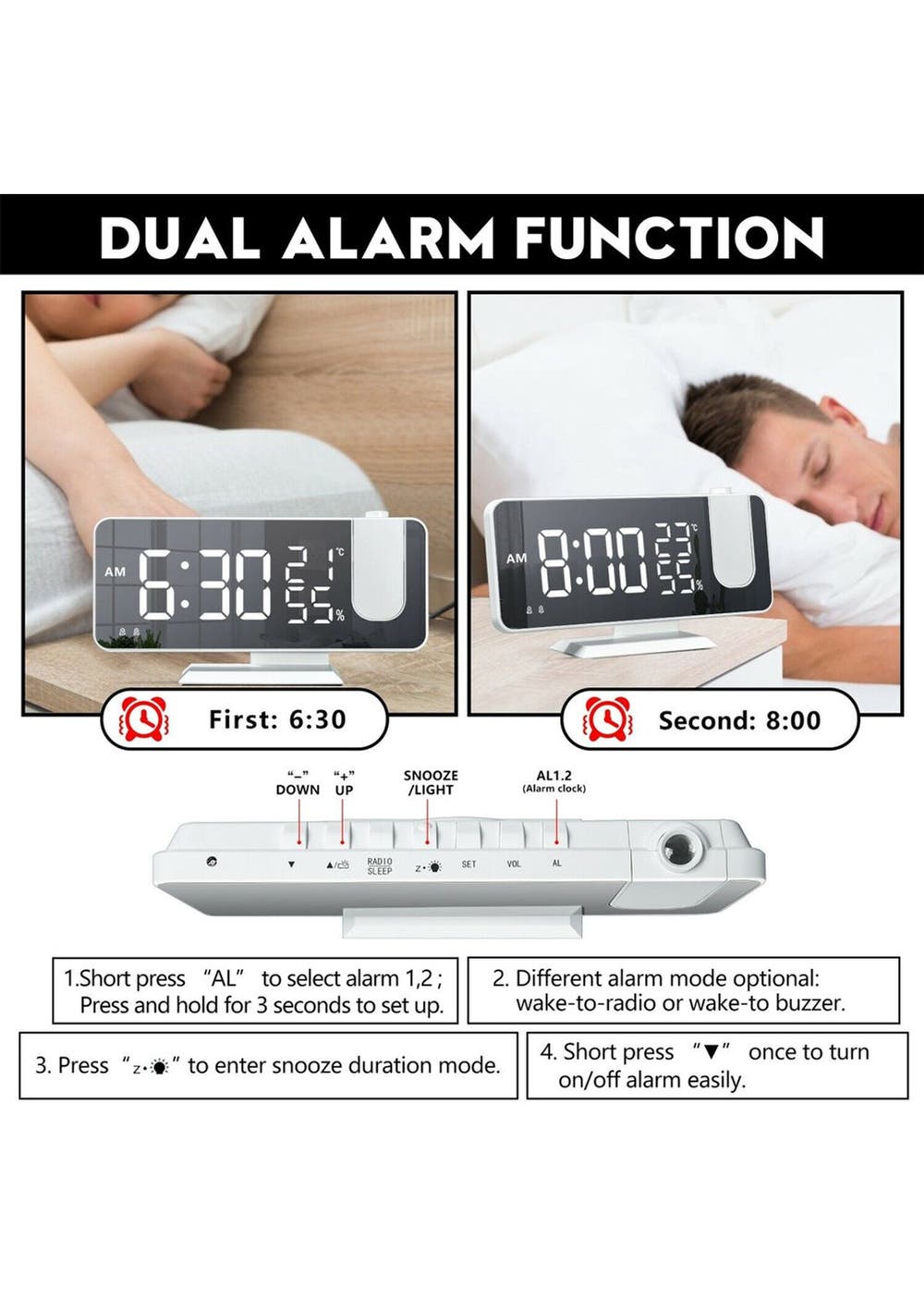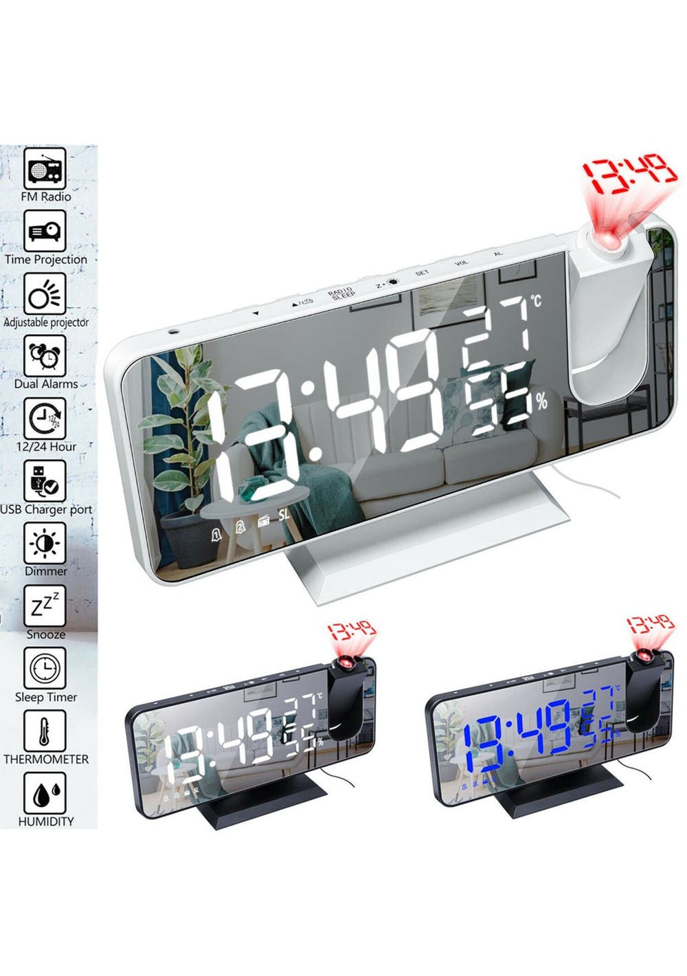 Product Description: This digital projection clock offers ultra-clear views of the time on your ceiling/wall with an enhanced adjustable 180 rotating projector, rotating the focus ring at the appropriate distance of 5m, making it easy to catch the time while you are in your bed without touching anything.This digital alarm clock is more than an alarm clock, but also an FM radio, it can store, scan, and lock your favorite radio station from 76.0 to 108.0 MHz, meeting the different radio standards of different countries. This digital alarm clock can be set two separate alarms for couples with different routines or a backup to wake up heavy sleepers. The alarm lasts for about 2 minutes and pressing the snooze button will give you another 5 minutes of sleep time. The brightness of the time display can be adjusted for 4 levels which can not only save power but also emit soft light for sleeping.The clock has a temperature display, with a temperature measurement range: 0¬°√¶~50¬°√¶ Error: plus, or minus 1¬°√¶ as well as a humidity display, with a humidity measurement range: 20%~95% error: plus, or minus 5%?Product Specification:Color: Black and Blue, Black and White, White and WhiteMaterial: ABSSize: 185*45*91mmWeight: 250gFunctions: LED Alarm ClockPower Supply: USB Cable Plugged-in?Package Inclusion:1 * LED Alarm Clock1 * Power Cable 1 * User Manual