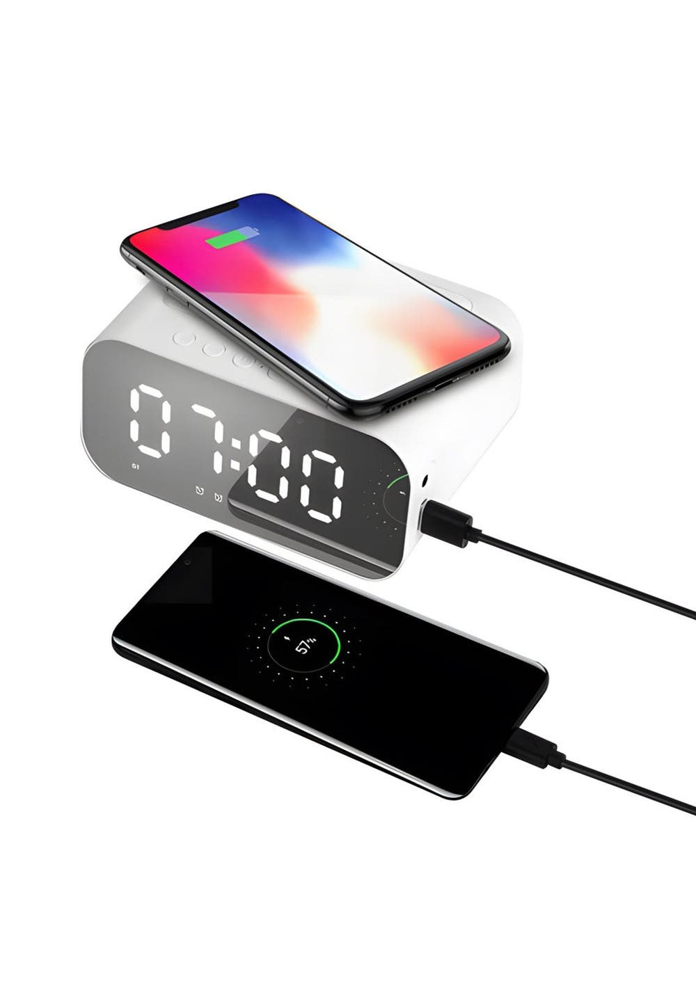 Product Description: As a wireless speaker, this device is equipped with a powerful stereo subwoofer, bass, that produces thick and treble sound, with clear and powerful drum sound, and stereo bass stereo effect. It has a passive diaphragm, giving you a clear and powerful 4D HiFi stereo bass experience.It is made out of lightweight and durable ABS plastic shell, perfect for home and office, built-in 2000mAh rechargeable lithium-ion battery, can provide up to 6 hours of working time, very suitable for family, parties, picnics, trips.It also comes with a built-in FM radio, in addition to listening to co-workers listening to music, it also increases listening pleasure, listening to favorite radio stations, and leisure matters. With its built-in high-definition microphone, the mobile phone is easy to connect, the call sound is as clear and bright as music, and there is no delay to reduce noise.It also supports wireless charging, with 5W Qi certification standard, can be used with all Qi-compatible devices, including iPhone 8/8 Plus, iPhone X, iPhone Xs, iPhone Xs Max, iPhone Xr, Samsung Galaxy S9 / S9 + / S8 / S8 + / S7 and more, short circuit prevention, overvoltage protection, temperature control. The USB charger can conveniently charge mobile phones, iPods, and other electronic products.It has a full-size high-definition display, high-brightness LED backlight, support three-level brightness adjustment, considerate and energy-saving, multi-functional fashion, and non-monotonous customization. It allows you to wake up in the morning and sleep at night. The dual alarm clocks can be set and used independently.?Product Specification:Color: Black,WhiteMaterial: ABS, ElectronicsSize: 145*106*72mmWeight: 385gFunctions: Multifunctional ClockUsage Time: 6 hours (medium volume)Battery Information: 2000mAhSpeaker size: 50mmOutput Power: 10WPassive Vibration Diaphragm: 50mm x 1Port: AUX input, TYPE C, DC5V1ACharging power supply: DC5V2A / 9V2A.Output power: 5V / 9V, 1A == 2A 10W compatible with 5W, 7.5W, 10W matching automatic identificationFast charging: compatible with QC3.0 / QC2.0.?Package Inclusion:1 * Multifunctional Clock1 * Charging Cable1 * User Manual