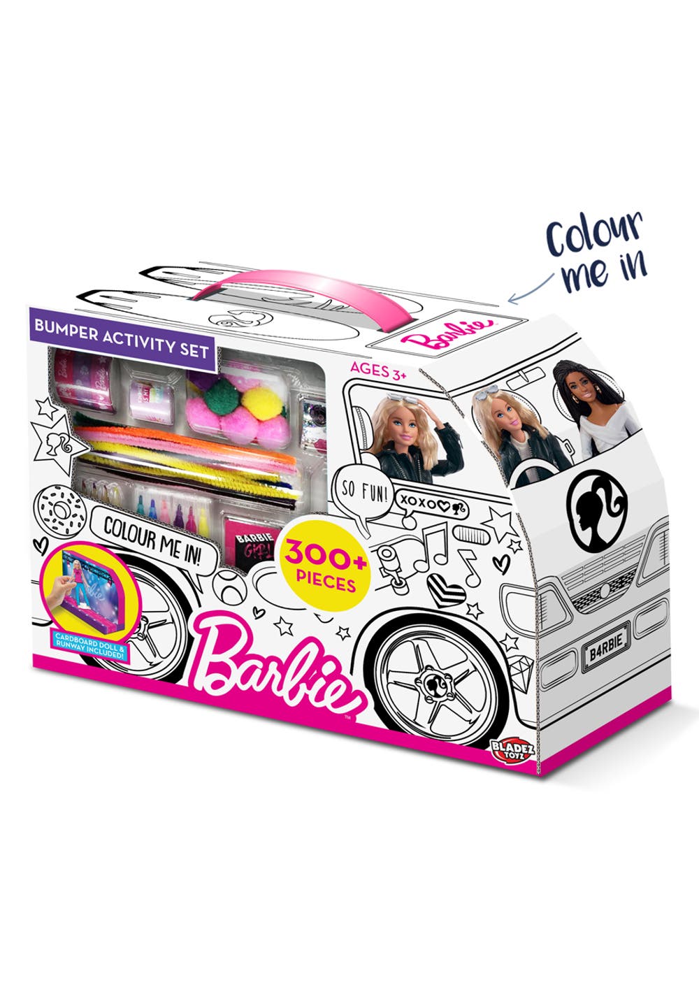 Get crafting with the 300+ piece Barbie Bumper Activity Set. Colour in the Barbie van storage box. The craft set includes felt tip pens, sticker sheets, foil stickers, foam shapes, washi tape, printed paper, pipe cleaners, wool, paper strips, pom poms, paper doll kit, colour-in poster, activity sheets and more! Cardboard doll and runway included! 300+ piece craft set Colour in Barbie van No glue needed