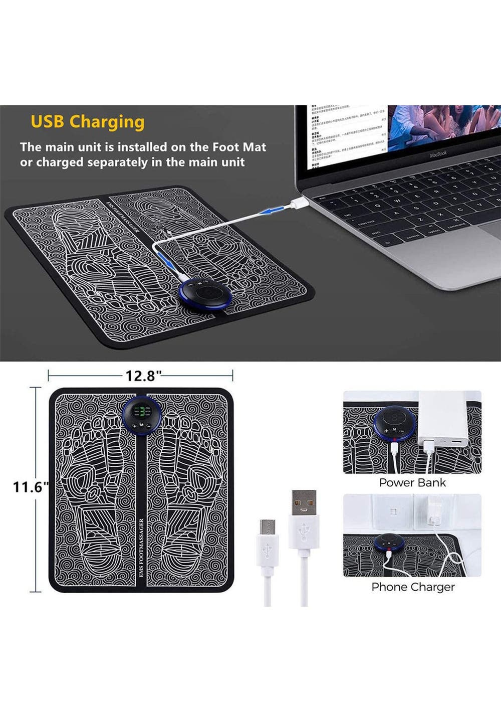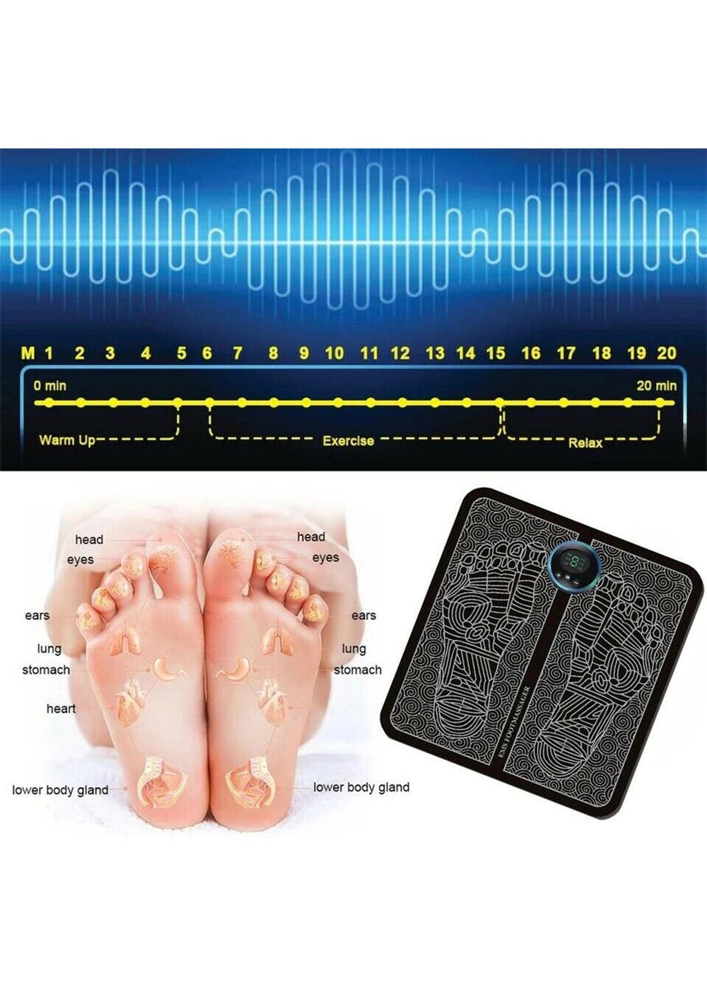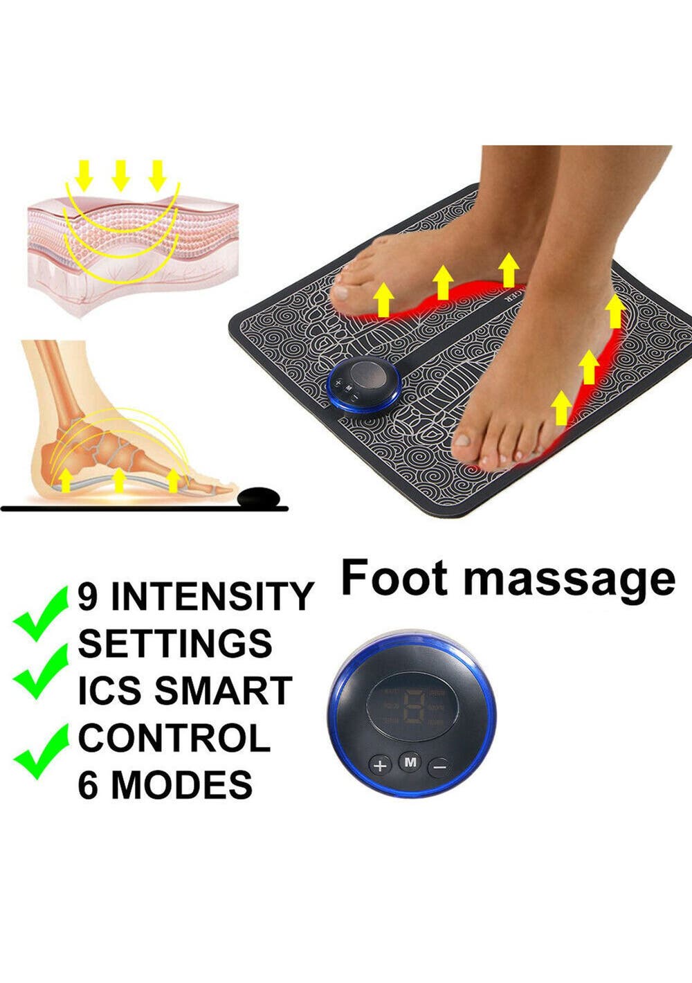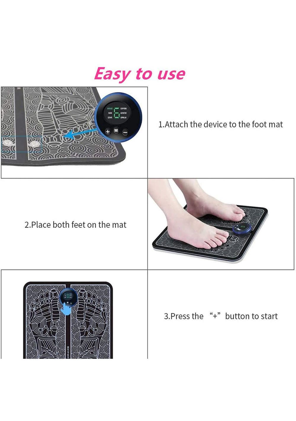 Product Description: This is a soft and comfortable footpad and the cushion has a foldable and lightweight design and can be carried anywhere. This foot massager uses EMS technology, effectively massages your foot, ankles, Achilles tendons up to your calf muscles.This massager promotes effective blood circulation, reduces fatigue, and helps relax your feet. Please do not use this foot massager if you are using a pacemaker or you currently have high blood pressure and take off your socks and place both of your feet before using.This foot massager is equipped with an LCD that shows the mode and intensity that the massager is currently on. It has 6 massage modes, combined with 9 levels of intensities to directly stimulate your acupressure points. Using this in the long run will help slow down your physical and mental fatigue and improve your sleeping habits.This foot massager is equipped with 240mAh built-in battery and supports USB charging. To prevent the user from using the massager excessively, you can only use this for 15 minutes each session, after the stipulated time, the massager will power off automatically and you have to reset for it to work for another session.?Product Specification:Color: BlackMaterial: PU Leather, Silver Paste, EVA foam cotton boardSize: 325*325MMWeight: 250gFunctions: Foot MassagerBattery Information: 240mAh?Package Inclusion:1 * Foot Massager1 * Charging Cable1 * User Manual ?