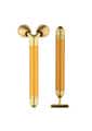 Product Description: The face massager set come with two types of beauty tools, one is 3D roller facial massager and T-shape electric facial massager, which can meet your needs in different scenarios. Enjoy your skin care time with them.Daily use of the face roller massage set will make your face and skin look more beautiful. Also, it can combine with skin care products and promote better absorption. The T shape and 3D roller face massager allows you to use the product on any part of your body from the angle that you prefer.The 3D roller electric face massager surface diamond-grade cut with small diamond shape and unique 3D "V" type design to fits well to every corner of face, make you enjoy comfort experience. T-shape is designed for 6000 vibe per/min and is good for skin.Give the special one a gift of love. The face massager kit comes in a beautifully designed package, which can be a meaningful gift for elder, mom, grandma, wife, daughter, sister. Besides, you can enjoy face massager for face care while taking a bath due to a special waterproof design.?Product Specification:Color: Gold, Rose Gold, Black, SilverWeight: 320gMaterial: MetalSize: 3D Roller Massager 15 x 6 cm, T Shape Massager 15 x 3.5 cmPower Supply: 1 x AA Battery (Not Included)Function: Face Lifting Facial Massager?Package Inclusion:1 x 3D Roller Face Massager1 x T Shape Facial Massager