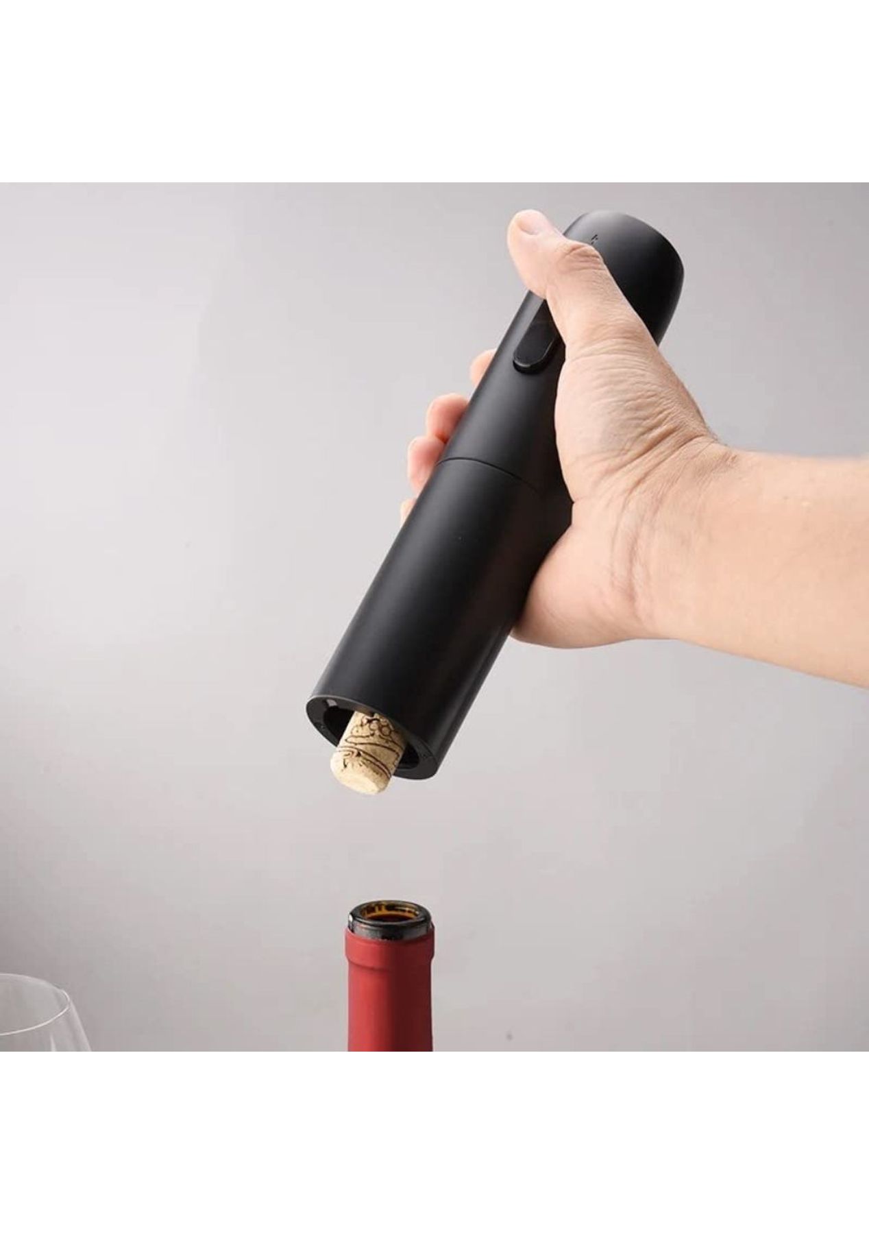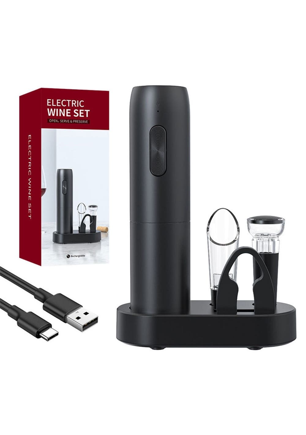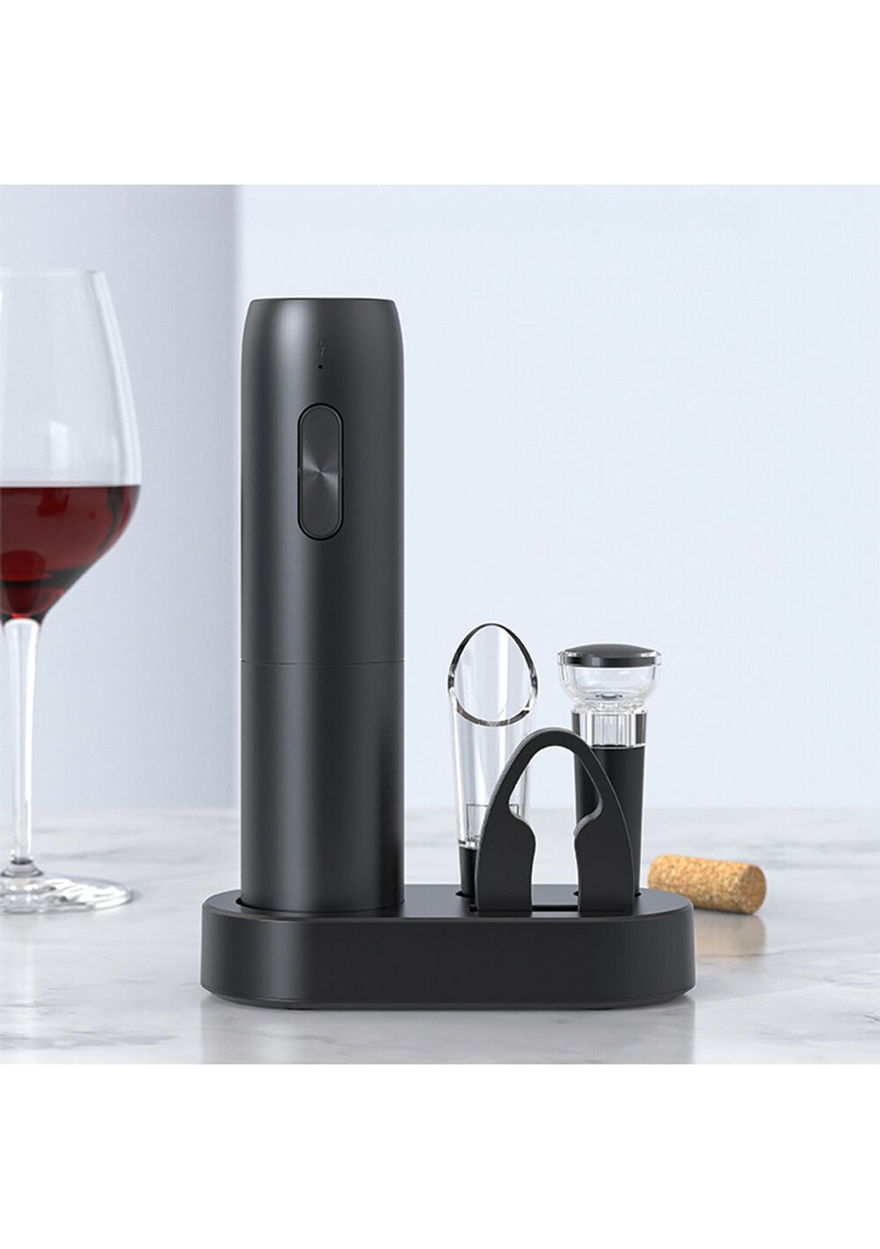 Product Description:Exquisite all-in-one wine bottle opener set offers everything needed to start enjoying the finest wines! With this set, opening wine bottles and pouring becomes a seamless experience. Quick cork extraction is achieved with the battery-operated rechargeable electric wine opener, which opens any traditional wine bottle with minimal effort. It operates noiselessly and quickly, safely removing corks in seconds. The set includes an electric bottle opener, vacuum fresheners, a wine aerator, a foil cutter, and an ABS charging base. This multi-functional package caters to all the needs in the red wine drinking process, making it indispensable for wine enthusiasts. Convenient storage is provided by the elegant LED charging base, which allows for simultaneous charging, storage, and display of the electric wine bottle opener. It’s a stylish addition to any kitchen countertopProduct Specification:Material: Aluminum Color: Black Size: 21.5x4.8 cm / 215x48 mm Weight: 420g Function: Wine openerPackage Inclusion:1 x Wine bottle opener 1 x USB charging cable 1 x Instruction manual