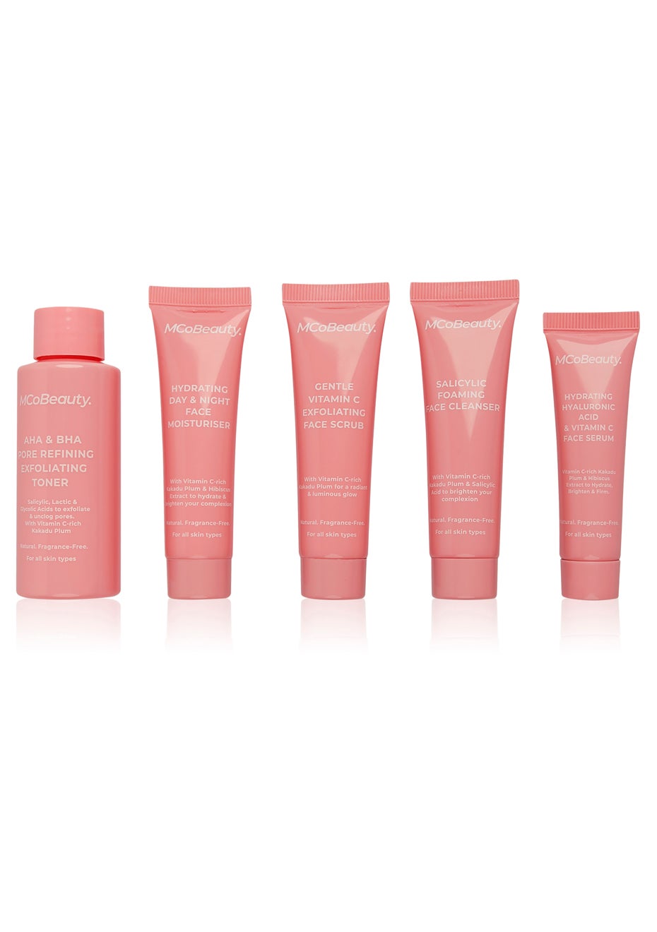 Get salon-quality skincare at a fraction of the price with MCoBeauty's ultimate discovery kit, featuring convenient travel-friendly versions of our glow-boosting natural skincare range. Products included: Salicylic Foaming Face Cleanser (20ml) Gentle Vitamin C Exfoliating Scrub (20ml) AHA/BHA Pore Refining Exfoliating Toner (30ml) Hydrating Hyaluronic Acid & Vitamin C Serum (10ml) Hydrating Day & Night Face Moisturiser (20ml) Salicylic Foaming Face Cleanser: Aqua (Water), Coco-Betaine, Sodium C14-16 Olefin Sulfonate, Sodium Cocoyl Isethionate, Glycolic Acid, Phenoxyethanol, Caprylyl Glycol, Salicylic Acid, Potassium Sorbate,  Terminalia Ferdinandiana (Kakadu Plum) Fruit Extract, Podocarpus Elatus (Illawarra Plum) Fruit Extract, Pleiogynium Timorense (Burdekin Plum) Fruit Extract, Backhousia Citriodora (Lemon Myrtle) Leaf Oil, Pelargonium Graveolens (Geranium) Flower/Leaf/Stem Extract, CI 17200, Geraniol, Linalool. Gentle Vitamin C Exfoliating Scrub: Aqua (Water), Cellulose Acetate, Cetearyl Alcohol, Glyceryl Stearate SE, Caprylic/Capric Triglyceride, Cocos Nucifera (Coconut) Oil, Glycerin, Stearic Acid, Phenoxyethanol, Caprylyl Glycol, Macadamia Integrifolia Seed Oil, Prunus Amygdalus (Almond) Seed Oil, Ceteareth-20, Cyclopentasiloxane, Salicylic Acid, Xanthan Gum, Terminalia Ferdinandiana (Kakadu Plum) Fruit Extract , Podocarpus Elatus (Illawarra Plum) Fruit Extract, Pleiogynium Timorense (Burdekin Plum) Fruit, Backhousia Citriodora (Lemon Myrtle) Leaf Oil, Pelargonium Graveolens (Geranium) Flower/Leaf/Stem Extract, CI 17200, Geraniol, Linalool. AHA/BHA Pore Refining Exfoliating Toner: Aqua (Water), Glycolic Acid, Propylene Glycol, Lactic Acid, Sodium Hydroxide, Hamamelis Virginiana (Witch Hazel) Bark/Twig Extract, Betaine, Glycerin, Phenoxyethanol, Aloe Barbadensis Leaf Juice, Alcohol , Salicylic Acid, Chamomilla Recutita (Chamomile) Flower Extract, Terminalia Ferdinandiana (Kakadu Plum) Fruit Extract, Podocarpus Elatus (Illawarra Plum) Fruit Extract, Pleiogynium Timorense (Burdekin Plum) Fruit, Ethylhexylglycerin, CI17200. Hydrating Hyaluronic Acid & Vitamin C Serum: Aqua, Niacinamide (Vitamin B3), Glycerin, Aloe Barbadensis Leaf Juice, Propanediol, Erythritol, Hibiscus Sabdariffa Leaf/Fruit Extract, Phenoxyethanol, Rosa Damascena Flower Water, Dicaprylyl Carbonate, Sodium Acrylates Copolymer, Tocopherol (Vitamin E), Sodium Hyaluronate, Terminalia Ferdinandiana (Kakadu Plum) Fruit Extract, Podocarpus Elatus (Illawarra Plum) Fruit Extract, Pleiogynium Timorense (Burdekin Plum) Fruit, Lecithin, Ethylhexylglycerin, Backhousia Citriodora (Lemon Myrtle) Leaf Oil, Pelargonium Graveolens (Geranium) Flower/Leaf/Stem Extract, CI 17200, Geraniol, Linalool. Hydrating Day & Night Face Moisturiser: Aqua (Water), Prunus Amygdalus (Almond) Seed Oil, Glyceryl Stearate SE, Cetearyl Alcohol, Caprylic/Capric Triglyceride, Phenoxyethanol, Caprylyl Glycol, Glycerin, Ethylhexyl Palmitate, Macadamia Integrifolia Seed Oil, Cyclopentasiloxane, Erythritol, Ceteareth-20, Theobroma Cacao Seed Butter, Butyrospermum Parkii (Shea) Butter, Xanthan Gum, Guar Hydroxypropyltrimonium Chloride, Hibiscus Sabdariffa Leaf/Fruit Extract, Sodium Hyaluronate, Terminalia Ferdinandiana (Kakadu Plum) Fruit Extract, Podocarpus Elatus (Illawarra Plum) Fruit Extract, Pleiogynium Timorense (Burdekin Plum) Fruit, Backhousia Citriodora (Lemon Myrtle) Leaf Oil, Pelargonium Graveolens (Geranium) Flower/Leaf/Stem Extract, CI 17200, Geraniol, Linalool. Onceit sources product globally. Onceit displays a strikethrough price based on the Manufacturer's Recommended Selling Price (MRSP) or recommended retail price (RRP) to show a price comparison. The discount percentage reflects the difference between Onceit's selling price and the MRSP or RRP. Suppliers provide these prices as either the official price set by the retailer or brand, which may vary between different retailers and regions or the price they recommend for sale. While we require suppliers to provide evidence of an RRP or MRSP, the product may not have been sold at that price before or recently in New Zealand. NZD RRP or MRSP is provided by the supplier or calculated by using the market spot rate at time of listing, we use this as the strikethrough price and calculate the discount percentage based on the difference between this price and Onceit’s selling price.