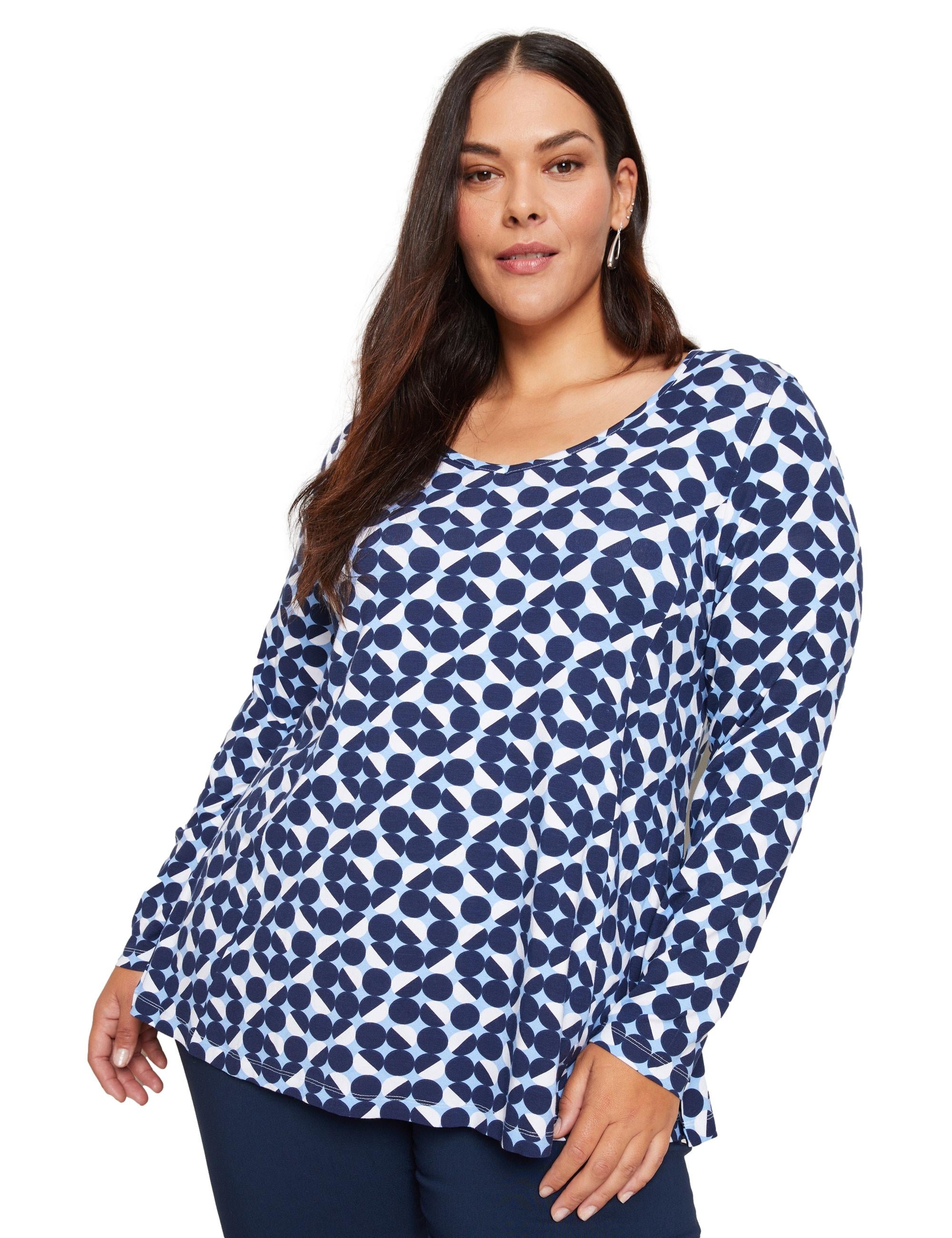 Autograph - Womens Plus Size - Tops - Winter - Basic - Blue - Long Sleeve - Scoop Neck - Relaxed Fit - Length Long - Spot Aztec - Casual Work Clothes