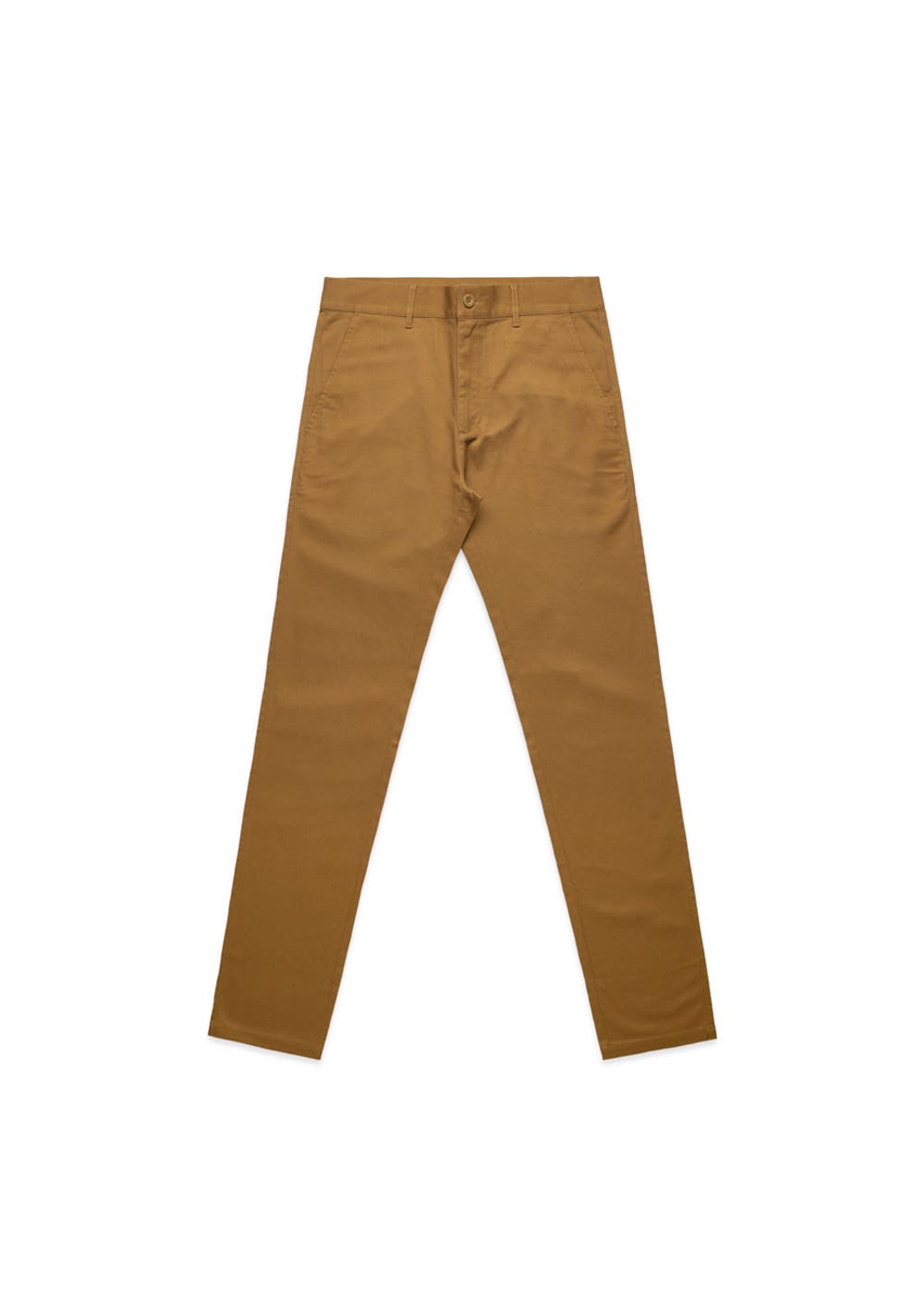 Slim fit Chino pants, 2 side pockets, jet pockets at back Mid weight, 280 GSM 98% cotton 2% elastane Belt loops on waist, button closure, anti-brass metal YKK zip fly, preshrunk to minimise shrinkage