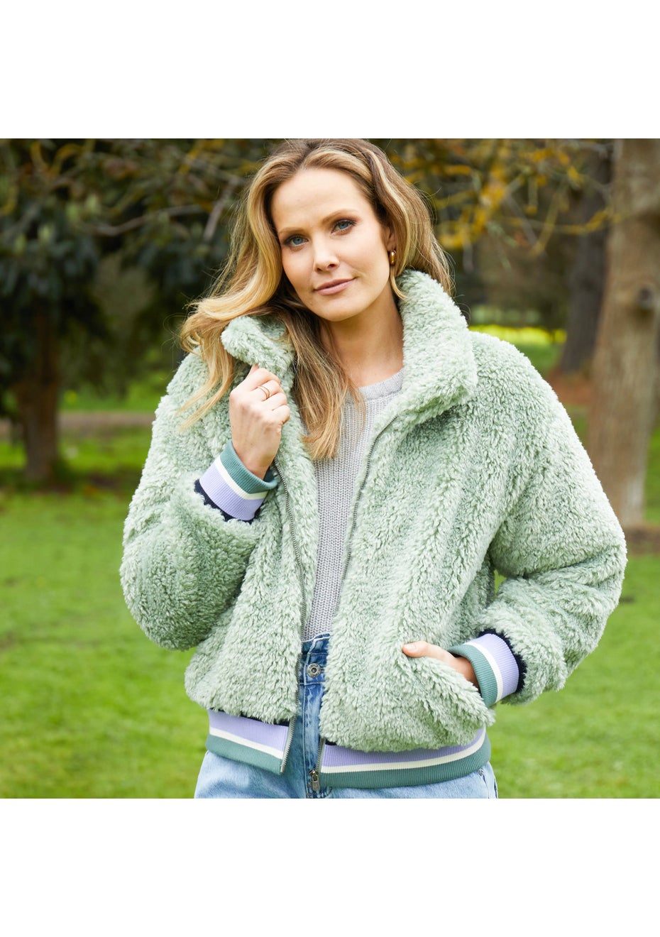Introducing the Reese Bomber Jacket: Embrace the ultimate coziness reminiscent of a cuddly teddy bear with this exquisite piece. Crafted from luxuriously soft faux teddy fur and thoughtfully lined throughout, this playful jacket boasts charming details like striped rib cuffs and hem, plus a convenient zip front for easy wear. Key Features: Fabric: Sumptuous faux teddy fur Lining: Fully lined for added comfort Closure: Smooth zip front opening Pockets: Handy pockets for your essentials Stylish Touch: Accentuated with stripe rib cuffs and hem band