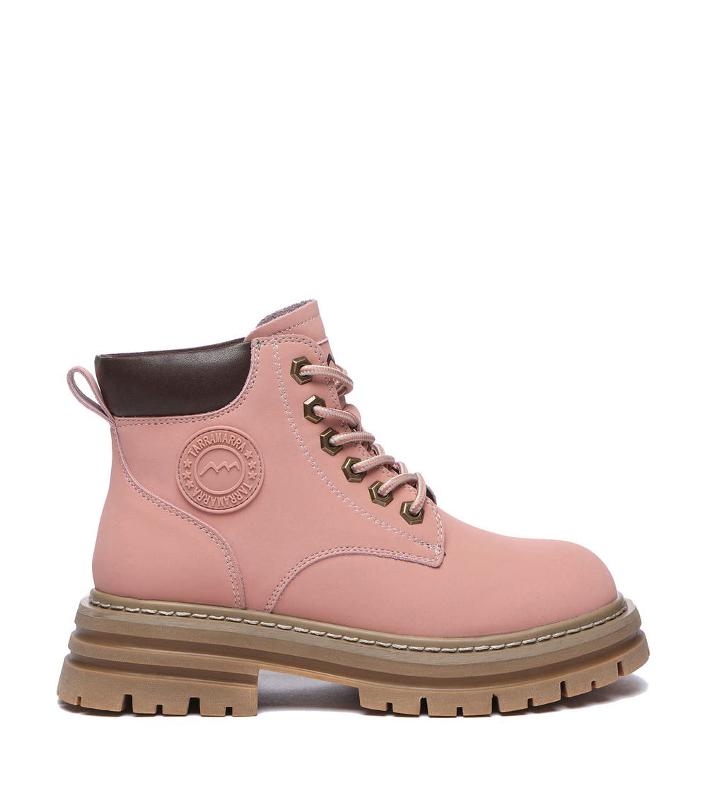 Get in the stylish boot groove, the Tarramarra Lace-up Aubrey Boots will become a staple in your streetwear wardrobe. The colour range gives you the chance to express yourself with this trendy design, available in chestnut, grey, pink and black. The upper cow leather design and sheepskin wool insole elevate comfort with style. Extra details including the glossy eyelet finish, chunky rubber sole and webbing heel loop for on-and-off ease add to the finishing touches of this boot design.