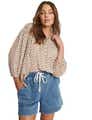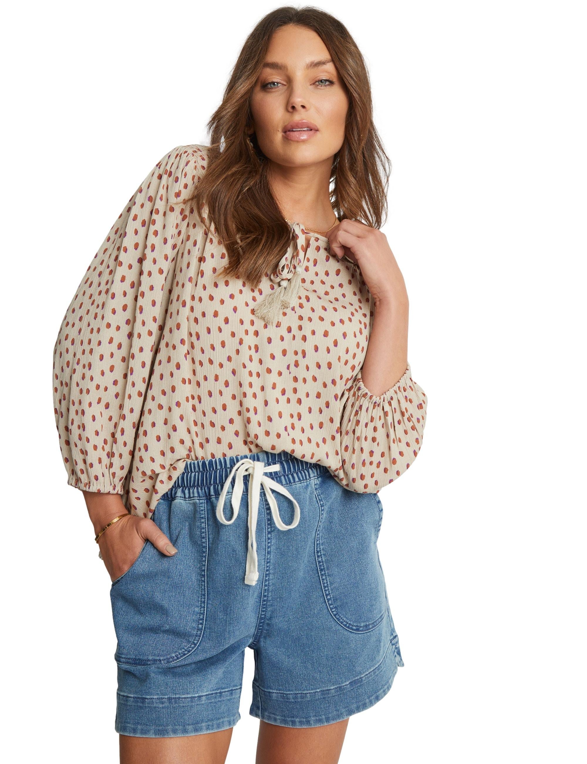 Rockmans - Womens Summer Tops - Brown Basic - Animal - Office Wear Work Clothes - Spots - 3/4 Sleeve - Woven - Shirred Shoulder Detail Casual Fashion