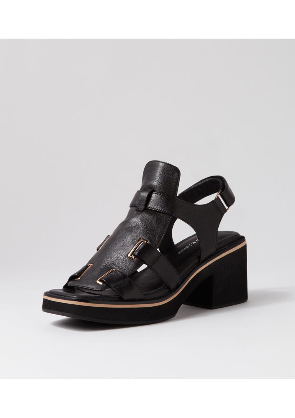 Elevate your style with the chic leather Jennis sandal by Django & Juliette in black. Chunky platform sole with gold hardware and loop-back velcro strap. Leather upper and lining with memory foam under the foot for added comfort.