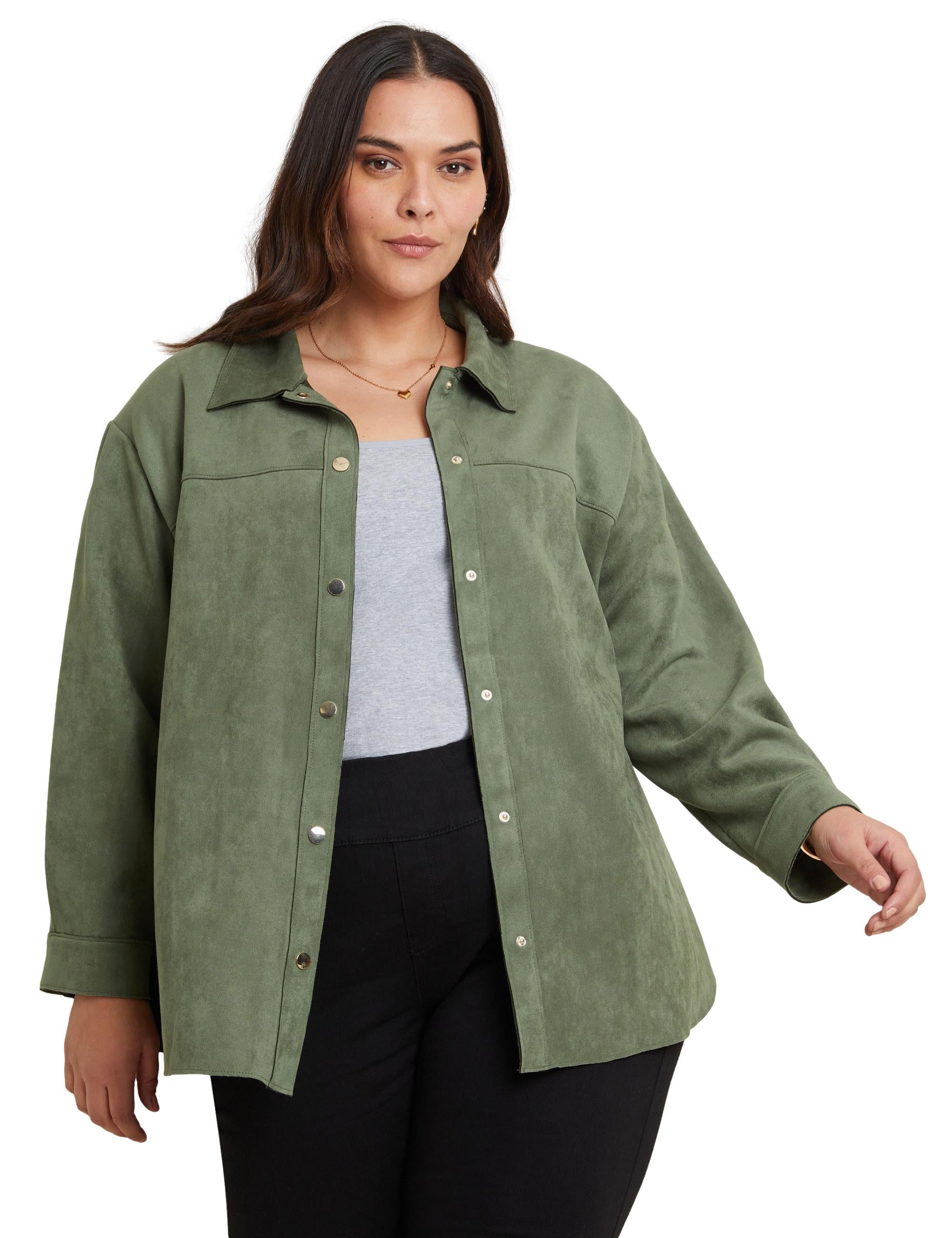 Autograph - Plus Size - Womens Long Jacket - Green Winter Coat - Shirt Style - Long Sleeve - Khaki - Blazer - Suedette - Casual Fashion - Work Wear