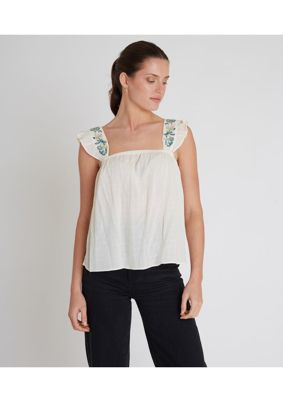 An easy top with airy flutter sleeves and fresh floral embroidery in breezy crinkled cotton.