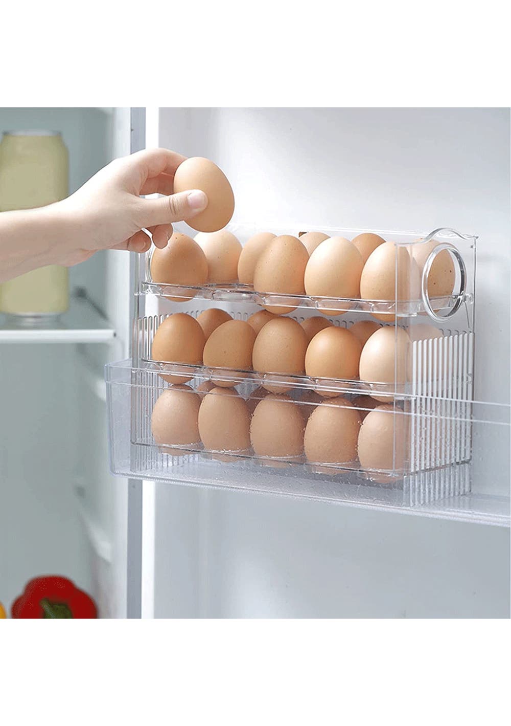 30 Eggs Holder for Refrigerator Flip Design<br><br>Material: PETl <br>Product dimensions (LWH): 20x26x10cm<br>Package dimensions (LWH):29x22x12cm <br> Weight:600 g<br>Feature<br>• SAVING SPACE: Egg storage container for the refrigerator can hold 30 eggs, which can be placed in the refrigerator door, making full use of the vertical space of the refrigerator, making the refrigerator look neat and orderly, and the groove design prevents it from being crushed or smashed. <br>• DURABLE MATERIAL: Our fridge egg storage box is made of environmentally friendly PET without bad odor. The separate egg trough leaves a suitable room for each egg, making the eggs breathe freely, make them keep fresh much longer. <br>• TURN-OVER DESIGN: The flip fridge egg holders top two layers can be turned over when each layer is used up, it is easier to take eggs and put them in. One grid holds one egg and can load the egg separately without bumping against each other. <br>• LARGE CAPACITY & STAY FRESH: The durable fridge egg holder is equipped with 30 slots to protect each individual egg, and the sliding date bar on the back allows you to easily record the storage date. To maximize the freshness of eggs. <br>• MULTIPURPOSE: This fridge egg tray for the refrigerator can be placed on the refrigerator shelf, on the fridge door, on the kitchen countertop, or taken to camping or to a party. The built-in handles make it easier to be moved and carried.<br><br><br>Package Include<br><br>1x Egg Holder