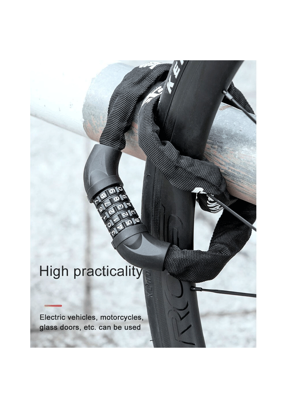 5 Digit Combination Anti Theft Bicycle Chain Lock<br>Product Description Revision:<br>Boost your bicycle's security with our 5-digit combination anti-theft bicycle chain lock. Made from robust materials and covered with a premium cloth cover to prevent scratches, this lock is easy to set up and convenient to use.<br>Key Features:<br>• Material: Carbon Steel, Zinc Alloy<br>• Product Dimensions (L): 100 cm<br>• Package Dimensions (LWH): 15x10x7cm<br>• Weight: 630g<br>• High Security: Comprising of a 5-digit password key, this lock can be configured into 100,000 unique combinations, significantly enhancing the security of your bicycle.<br>• Ease of Use: Forget complex setup steps. Simply turn and set your desired password to enjoy the safety provided by this lock.<br>• Protective Cover: The lock is enveloped in a high-quality cloth cover to avoid scratching your bicycle, be it a mountain bike or any other type.<br>• Versatile Applications: While ideal for bicycles, this lock also works great with motorcycles, electric bicycles, skateboards, sports equipment, gates and fences, grills, lawn mowers, tool boxes, ladders, generators, trolleys, scaffolding, etc.<br>• Convenience: Remembering a numeric password is all you need to unlock this chain lock, eliminating the worry of misplacing a key.<br>Package Includes:<br>• 1 * Heavy Duty Anti-Theft Chain Lock with 5-Digit Code<br>
