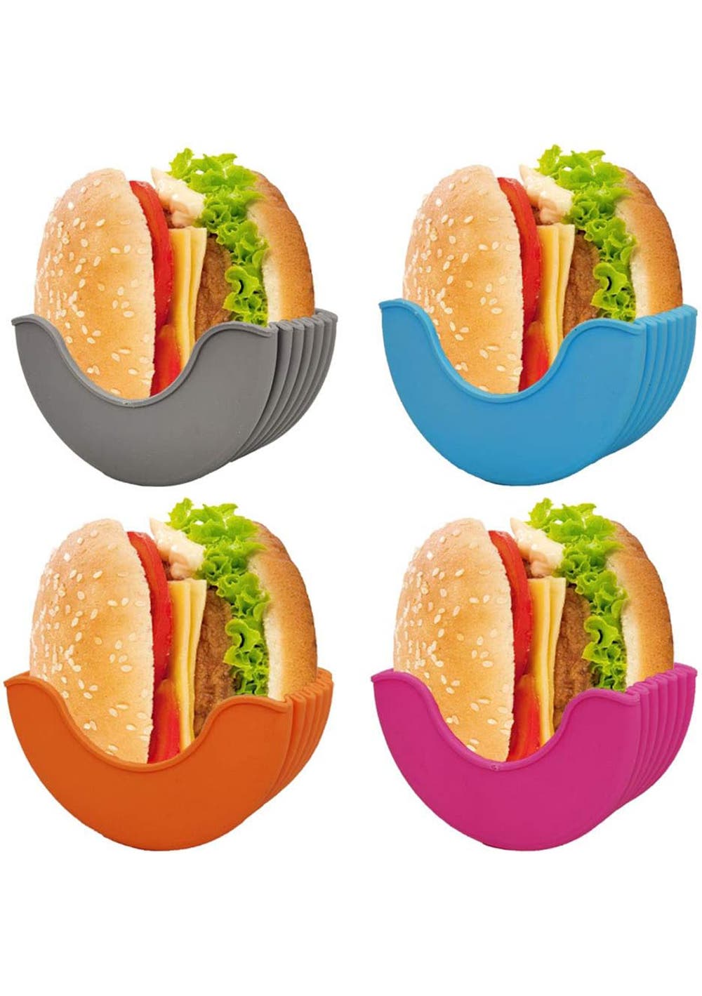 4 Pcs Hamburger Buns Burger Holder<br>Material: Silicone<br>Product dimensions (LWH): 10×6×5cm<br>Package dimensions (LWH): 13x6x6 cm<br>Weight: 70g<br>Unveil the Neat Way to Savor Burgers:<br>Introducing our Silicone Burger Holders, the trendy and mess-free solution for every burger enthusiast:<br>• Durability Meets Eco-Friendly: Crafted from BPA-free silicone, these holders are tough, eco-conscious, and built to last, making them your burger's best friend.<br>• The Talk of TikTok: With a fresh design that’s turning heads on social media, this holder is a conversation starter that also keeps your eating experience clean.<br>• Smart and Practical: The U-shaped notch and central cutout mean you enjoy maximum bite with minimum mess. The retractable base lets you savor every last bit without getting your hands dirty.<br>• Versatile Use: Not just for burgers—expand it for sandwiches, bagels, or donuts. The flexible design securely grips a variety of foods, making it a multipurpose gem.<br>• Hassle-Free Maintenance: Dishwasher safe and easy to clean, these holders are perfect for busy families, outdoor picnics, or anyone who loves a good burger without the fuss.<br>Package Includes:<br>• 4X Burger Holder<br>