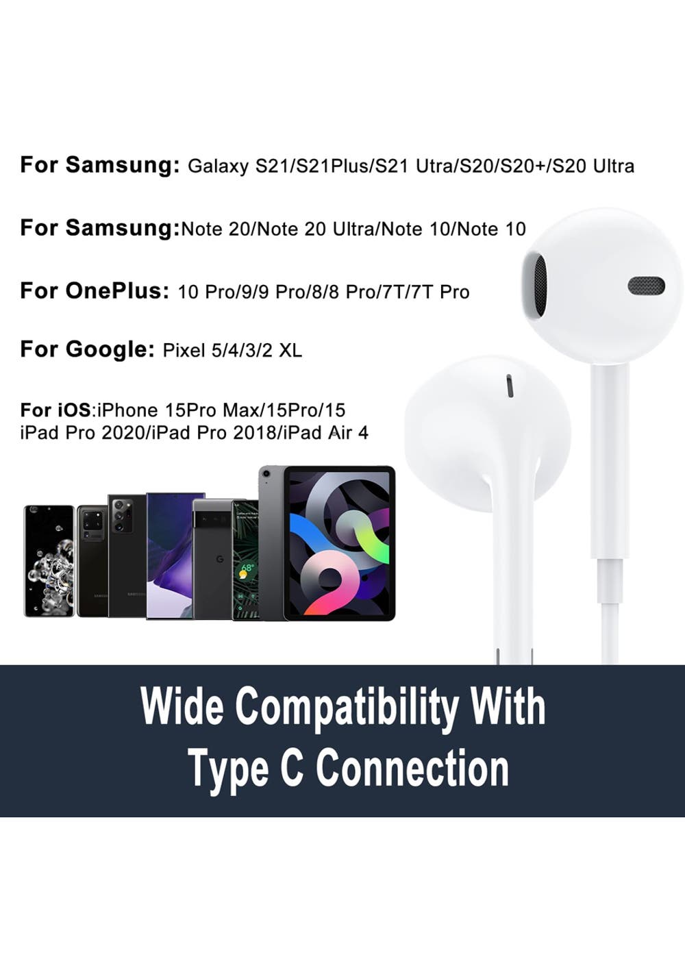 USB C In-Ear Earbuds for iPhone 15 & Android Phones Material: ABS Package dimensions (LWH):6X6X2CM Weight: 30G Designed to connect seamlessly with the latest iPhone 15 series, select iPad models, MacBook lines, as well as a vast range of Android devices that support USB C audio, including the Samsung S21 and S22 series, Google Pixel range, and many others. Built to Last: The earbuds are reinforced with a durable cord to resist wear and tear, complemented by metal-plated connectors that ensure a reliable connection and longevity. Audio and Call Management: Integrated with a user-friendly remote for effortless control over music playback, volume adjustment, and call handling, these earbuds provide convenience right at your fingertips. Comfort and Sound Clarity: An ergonomic fit ensures comfort during prolonged use, while the premium DAC chip enhances the audio experience with high-resolution sound quality, enriching your listening sessions. Effortless Functionality: Easy plug-and-play functionality ensures a hassle-free connection to all compatible devices without the need for an adapter. Package Contents: 1 x USB C In-Ear Earbuds