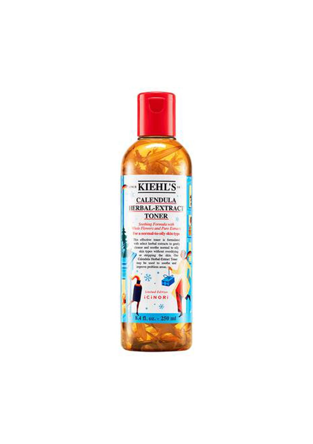 Beloved by Kiehl’s customers since the 1960s, and now available in a limited-edition holiday design by artist duo Icinori, our cult-classic alcohol-free toner is formulated with Calendula, which contains five skin-soothing compounds known to help relieve signs of distressed skin including visible redness, excess oil and sensitive skin. Our gentle formula is ideal for helping balance normal-to-oily skin, including sensitive skin types, for a more even complexion and soothed and refreshed-feeling skin. Featuring limited edition holiday design by artist duo Icinori Gently soothes and refreshes skin Helps relieve key signs of distressed skin including visible redness, excess oil and sensitive skin Cleanses skin without harsh or synthetic drying agents For normal-to-oily skin types, including sensitive skin Suitable for all skin types, including sensitive skin CALENDULA Native to the Mediterranean, Calendula Extract and Calendula Petals are known for their skin soothing properties and are commonly used in skincare products for oily skin types. For many centuries, Calendula has been highly regarded as a medicinal herb in both Ayurvedic and traditional Chinese remedy. ALLANTOIN Allantoin is a compound found in the root of the comfrey plant, a hairy perennial Eurasian herb long used in herbal remedies. Within our formulas, Allantoin is known to soothe and comfort skin. GREAT BURDOCK ROOT Great Burdock Root has been used for centuries to moisturise dry skin. Known for its soothing properties, Great Burdock Root is also believed to help reduce oil. After cleansing skin, moisten a sterile cotton pad with alcohol-free toner Smooth on skin in areas where needed, avoiding the eye area Apply day or night Explore the other products in our Calendula Skincare Collection like our foaming face wash, soothing face mask and serum-infused water cream