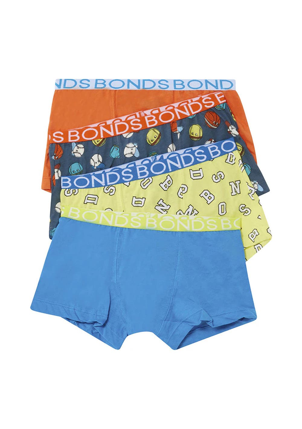 Buy two Boys Trunk 4 Packs to get them through a full week with a pair left over for emergencies. You know they'll love these cotton boys' undies because they're comfy Bonds, guaranteed. • Boys trunk undies in a value 4 pack • Supportive pouch with comfy Bonds trunk coverage • Bonds logo elastic they'll want to show off Material: Cotton. Manufactured In: Vietnam