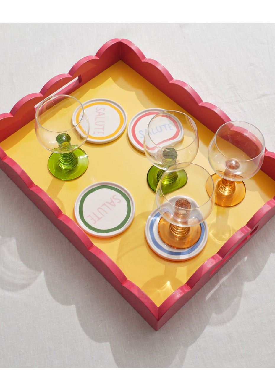 A two tone rectangular tray with yellow on the inside base and pink on the outside. Think poolside service with this!