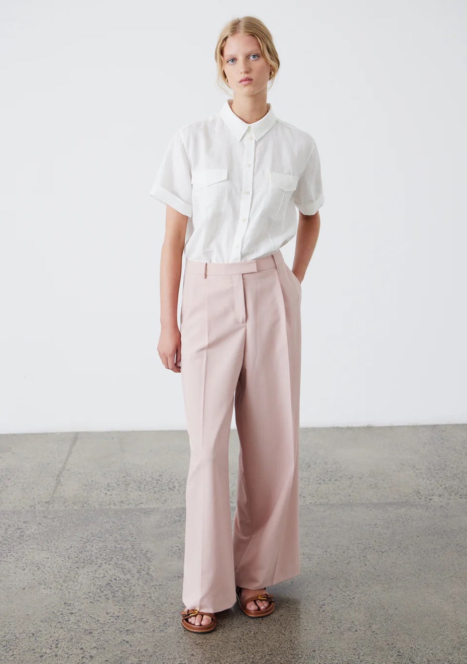 An update on our best-selling Ava Trouser. A tailored waist is complemented by a relaxed fit through the leg and finished with vented pockets at the back. Styled with the Boston Blazer - Rose, the Lisbon Shirt - White and the Leo Tank Cotton/polyester blend Single pleat Wide leg style Designed to sit just on the waist Cold hand wash with mild detergent. Dry out of sun. Light steam press Model is 5'10" a size 6/8 and is wearing size XS