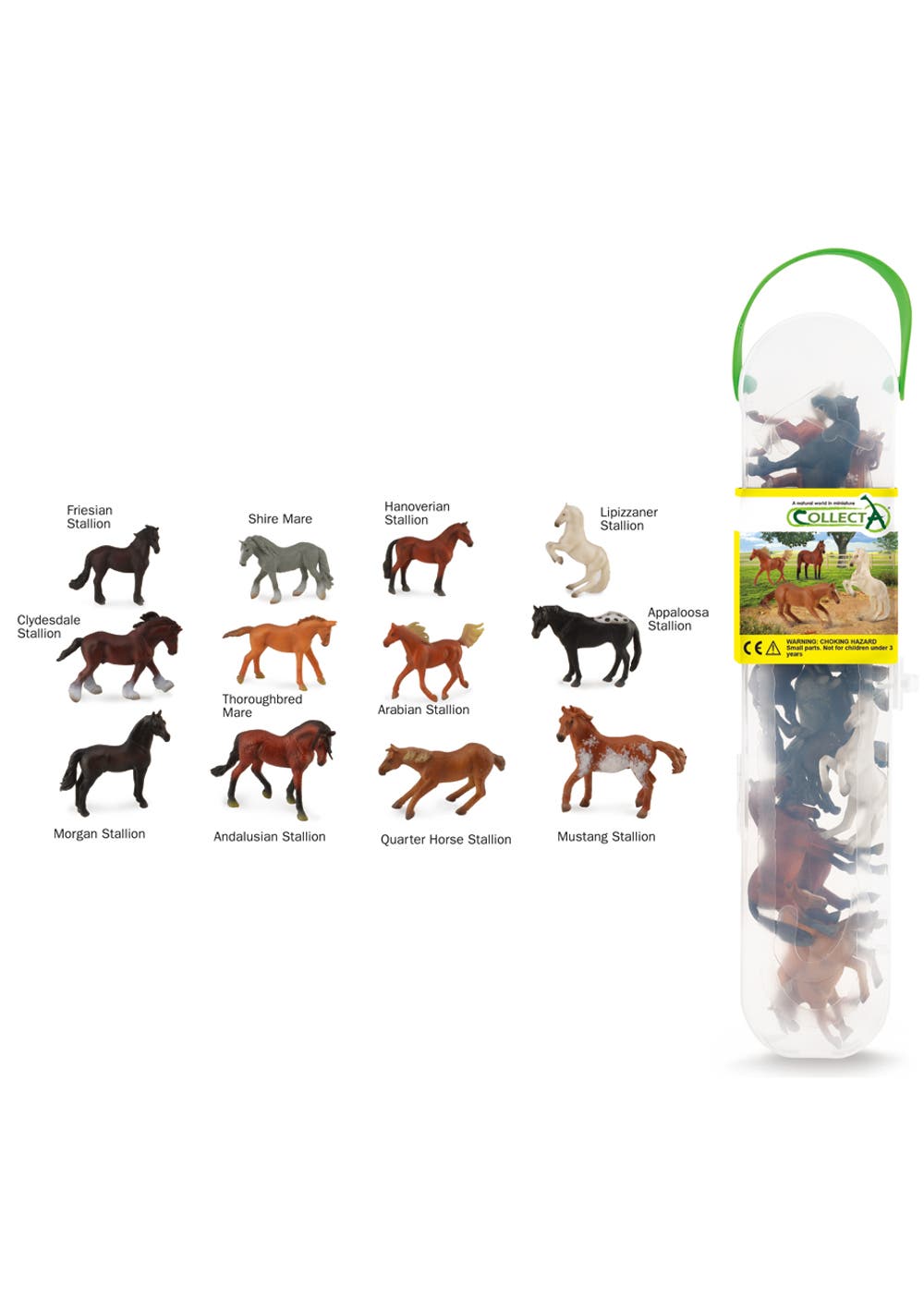 This Collector Case Tube (27x4.2cm) contains mini horses ranging from 3.5-6.5cm approx. each. Models includes 1 of each of the following horses: Mares: Shire, Thoroughbred; Stallions: Arabian, Mustang, Morgan, Andalusian, Hanoverian, Friesian, Quarter Horse, Clydesdale, Lipizzaner, Appaloosa. Working with experts from across the globe, CollectA hand-painted figurines are all factually accurate and palaeontologist-approved, so little ones get to learn while they play. All CollectA products are individually hand crafted with only the finest materials and rigorously tested to ensure they meet the highest safety standards. Material: Child Safe Non-Phthalate PVC Plastic Age: 3+ Suitable for ages 3 & up.