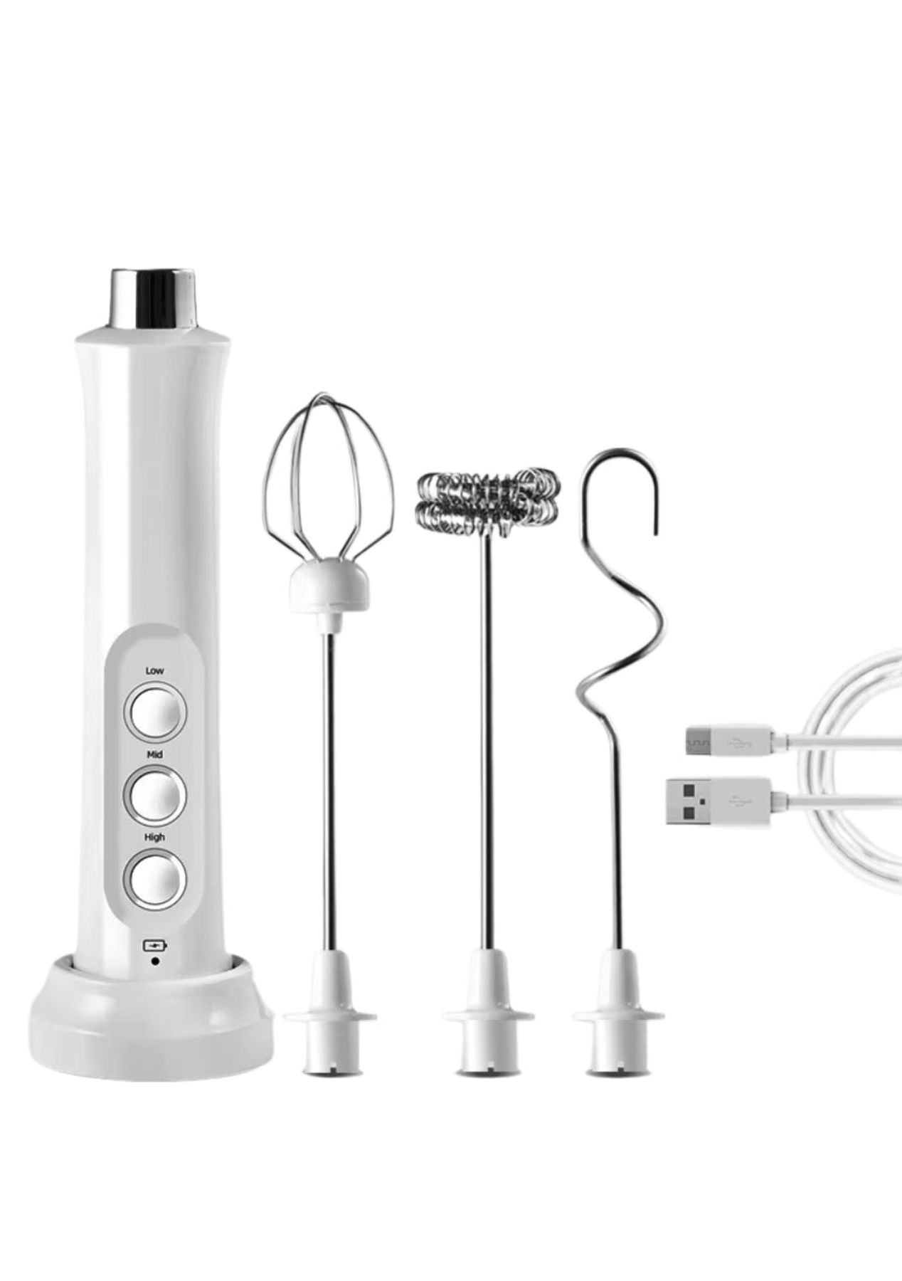 Product Description:The Coffee Milk Frother Egg Whisk is a versatile tool designed to enhance your coffee-making experience. Made from high-quality stainless steel, it offers durability and longevity for daily use. With a sleek, ergonomic design, this frother is easy to handle, ensuring you can create the perfect froth for your lattes, cappuccinos, or hot chocolate with ease.This 3-in-1 frother offers three adjustable speeds of 3500 RPM, 8500 RPM, and 13500 RPM, giving you control over the frothing intensity for various beverages. Powered by a 1200 mAh built-in battery, the frother can be recharged easily, with a green indicator light to signal when it's fully charged. Whether you're frothing milk, whisking eggs, or mixing protein shakes, this device has got you covered.In addition to its efficiency, the frother's stainless steel construction ensures it resists rust and remains easy to clean. However, for safety and longevity, it's important not to place it in the dishwasher. The compact design allows for easy storage and transport, making it perfect for coffee lovers at home or on the go.Enhance your coffee routine with the Coffee Milk Frother Egg Whisk, bringing convenience and quality to your kitchen. Whether you're a barista or a coffee enthusiast, this tool helps you craft café-style beverages effortlessly.Product Specification:Material: Stainless SteelColor: Black, WhiteBuilt-in Battery: 1200 mAhSpeed: 3500RPm & 8500RPM & 13500RPMCharging Time: 6 hoursWorking Time: 1 hour at high speed/ 15 hours at low speedPower: 2.5WCurrent: 0.5AVoltage: 4.5V-5.5VSize: 5.3 x 17.5 cmWeight: 263gFunction: Milk FrotherPackage Inclusion:1 x Host 1 x Baking mixing head1 x Milk froth mixing head1 x Milk powder mixing head1 x Charging Cable1 x Charging base