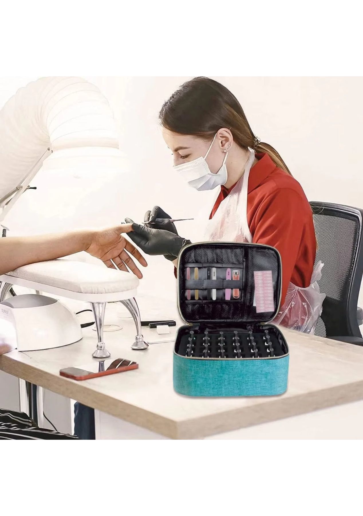 Product Description:The Portable Nail Polish Organizer is a must-have for nail enthusiasts and professionals alike. Made from soft polyester microfiber, this organizer offers superior protection for your nail polish collection with its padded interior. Its durable design ensures that your bottles stay in pristine condition, no matter where you take them.Featuring a detachable design, the organizer has two separate bags connected by a middle zipper. Each bag includes customized dividers, capable of holding up to 30 bottles. The dividers are flexible and detachable, allowing you to easily accommodate different bottle sizes and clean the organizer with ease.For added convenience, the organizer includes dedicated storage space for nail tools. The upper section is perfect for brushes and dotting tools, while a bottom zipper pocket provides ample space for manicure accessories. With handles on each bag, the organizer is easy to carry, making it perfect for travel.This organizer is the perfect solution for storing and transporting up to 60 bottles of nail polish. With its stylish design and functional features, it allows for easy organization and quick access to your favorite shades. Keep your collection safe and well-organized with the Portable Nail Polish Organizer.Product Specification:Material: PolyesterColor: Purple, Lake Blue, Blue, Grey, Pink, RoseSize: 24 x 21 x 18 cmWeight: 350gFunction: Nail Polish Organizer Package Inclusion:1 x Nail Polish Organizer