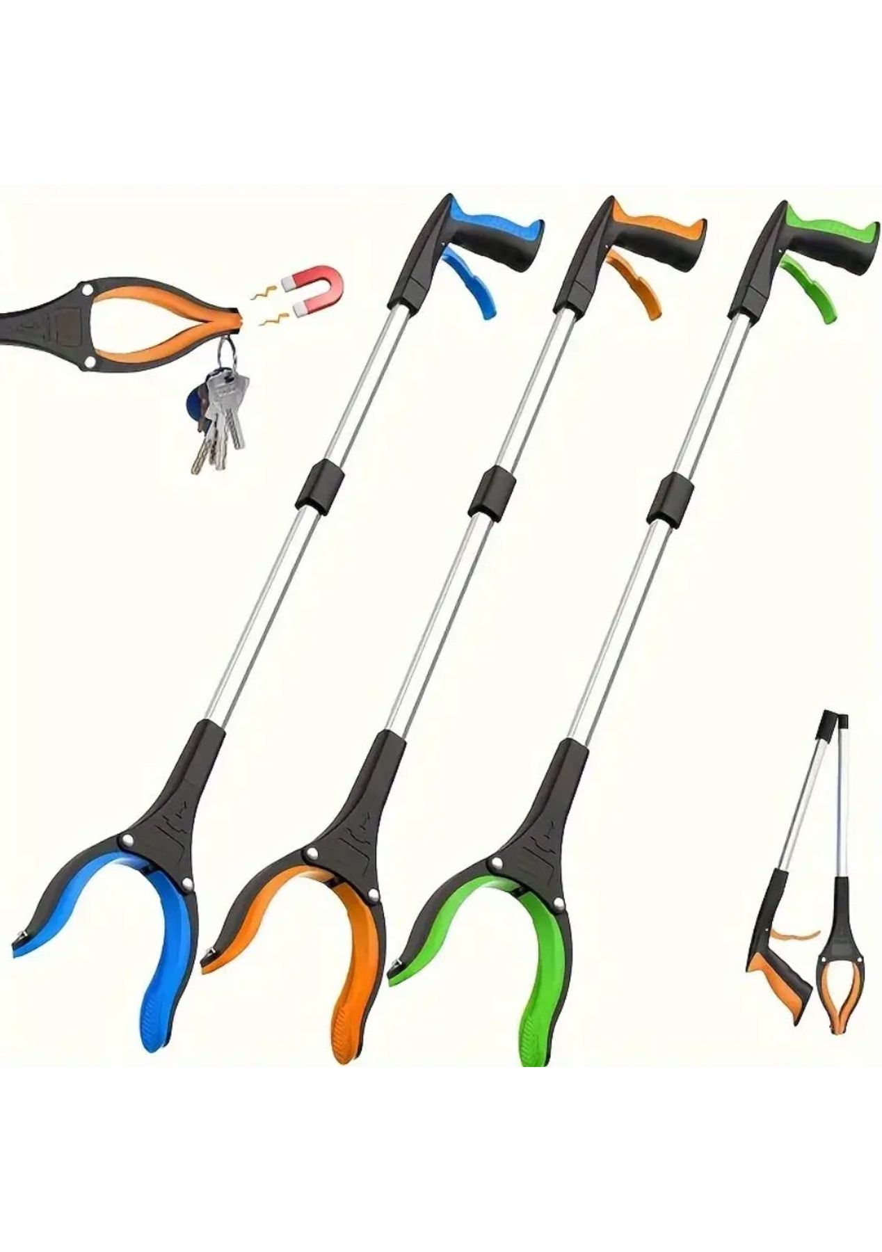 Product Description:The Grabber Reacher Tool is designed for everyday tasks, offering a reliable load capacity for both horizontal and vertical lifting. It is crafted from durable materials, making it ideal for users with limited mobility, those recovering from surgery, or anyone needing assistance with outdoor cleaning tasks. This tool helps users safely reach and pick up items.Its easy-to-use design features a grabber pickup tool that keeps the item's center of gravity closer to the user during grabbing. The tool includes a sturdy internal wire and a sensitive trigger, reducing pressure on the hands and wrists for smooth, effortless control.The grabber tool is equipped with a silicone jaw that ensures a non-slip grip when handling objects, including small and thin items like pills, coins, and paper. Its enhanced grip strength offers more security during use.With a rotating head and a built-in magnet, the tool allows for easy reach in any direction without twisting the arm or wrist. The magnet helps pick up small metallic items such as nails or coins. Its folding design shrinks the grabber down for convenient storage, while the available color options add a stylish touch to this functional tool.Product Specification:Material: ABS + Stainless SteelColor: Blue, Green, OrangeSize: 10 x 43.18-83 cmWeight: 235gFunction: Grabber Reacher ToolPackage Inclusion:1 x Grabber