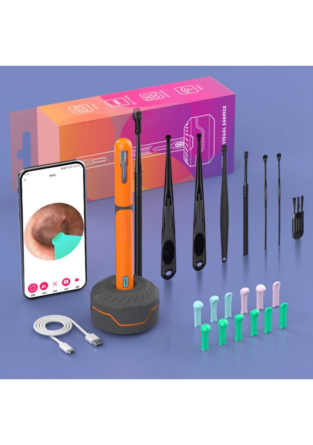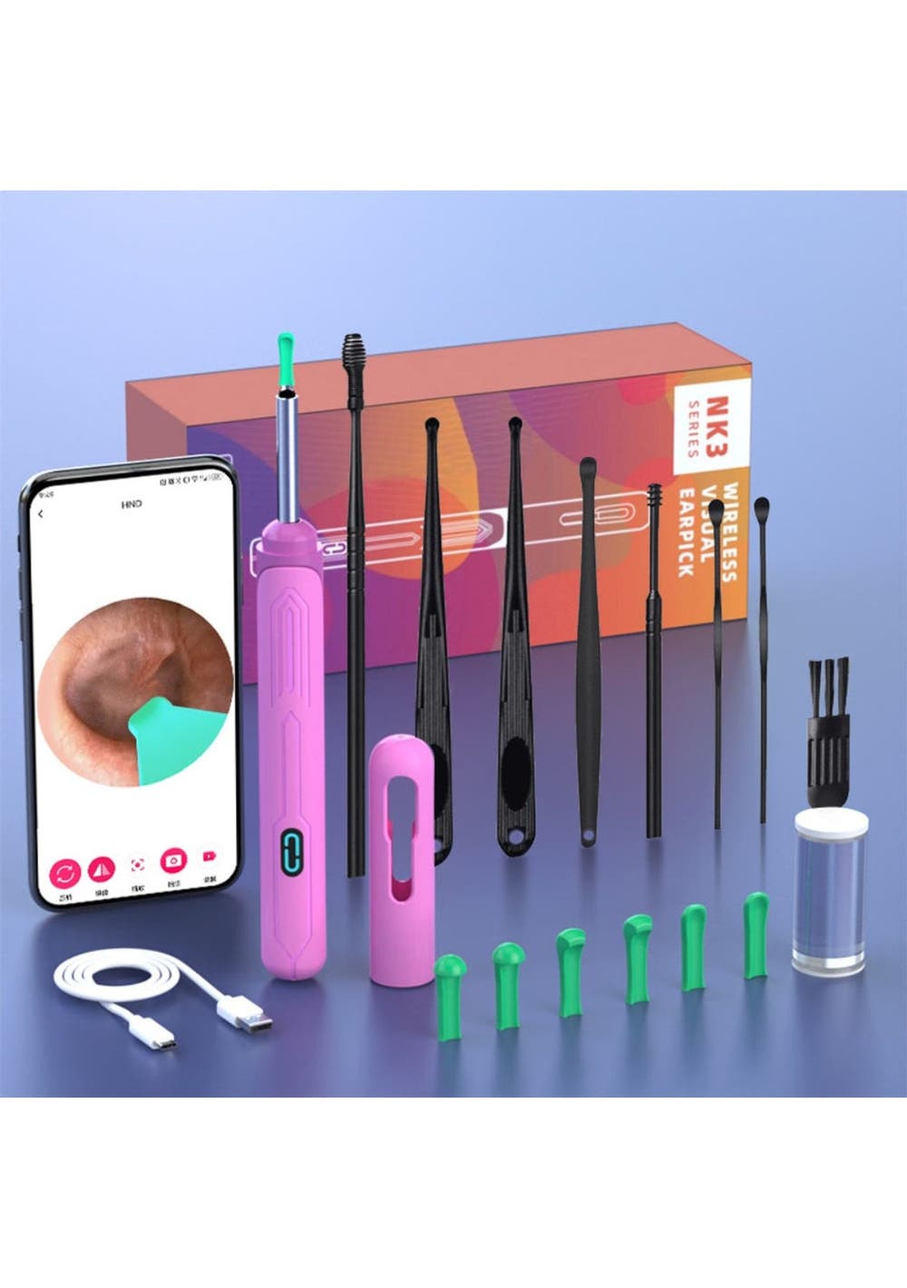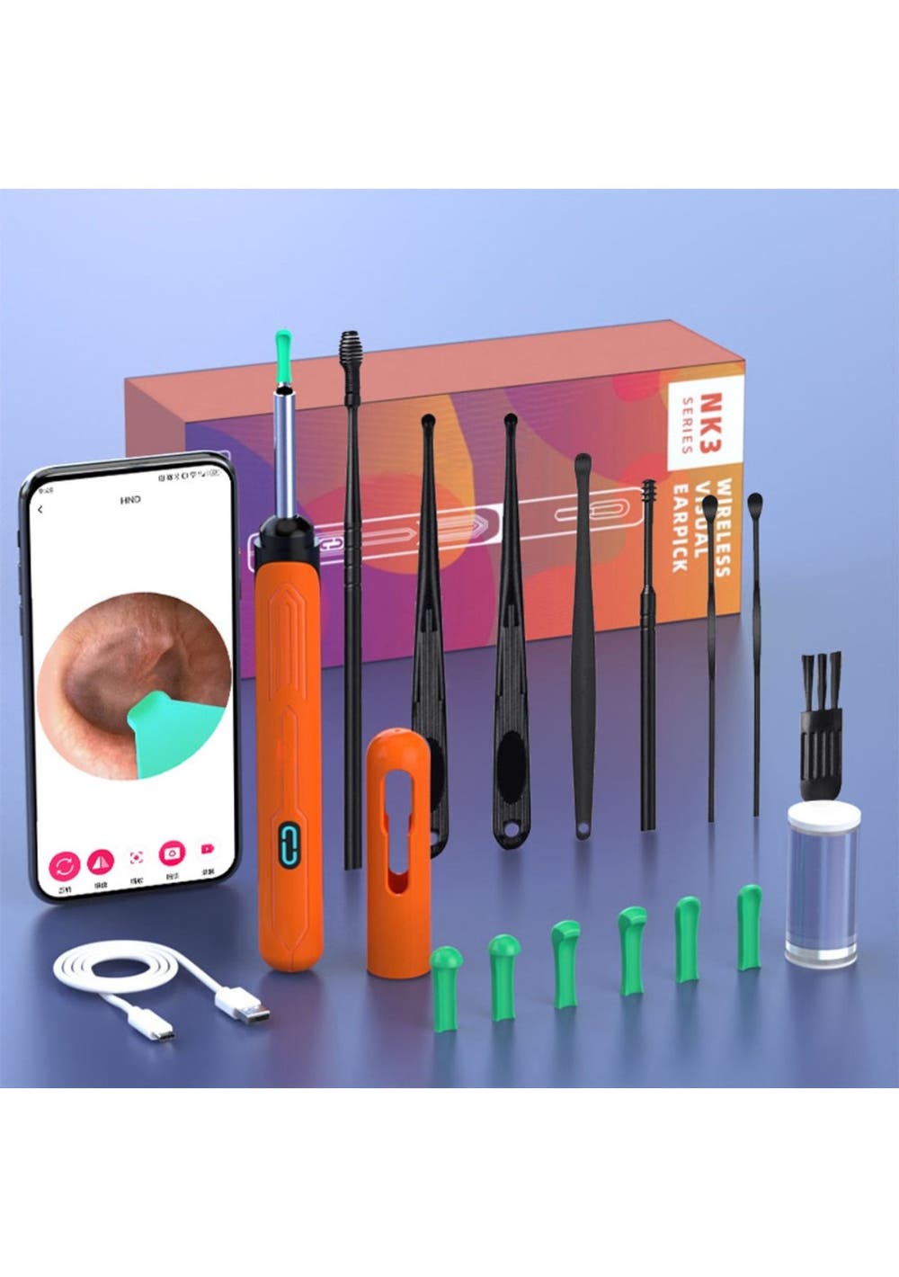 Product Description:The Smart Visual Ear Cleaner Set offers a modern and effective solution for safe and efficient ear cleaning. With a wireless otoscope, USB C charging, and a mini camera, it eliminates the need for traditional ear cleaning methods, ensuring precise and comfortable use for all members of the family. Its advanced design allows you to clean your ears with confidence, replacing outdated tools with high-tech functionality.This set features the upgraded NK3 Wireless Otoscope, fully compliant with FCC, RoHS, and CE standards. Its harmless accessories make it suitable for all ear types, even oily ears, ensuring safe use for everyone, including pets. You can trust this tool to provide an improved ear cleaning experience, offering both comfort and accuracy.Equipped with a 360° wide-angle lens and 1296P HD image, the ear cleaner delivers clear visuals of the ear canal in real-time, allowing for precise removal of wax buildup. The high-definition imagery promotes better hygiene and health, making it easier to monitor and maintain the cleanliness of your ears.Using the Smart Visual Ear Cleaner Set is simple, thanks to its wide compatibility with Android and iOS devices. The accompanying app ensures ease of use, allowing for quick setup and real-time monitoring. In addition to ear cleaning, this versatile tool can be used for skin, nose, and teeth examinations, making it an essential home helper for maintaining the health of both family members and pets.Product Specification:Material: Soft PCColor: Orange, White, Black, Yellow, PinkSize: 15 x 5.6 cmWeight: 71 gFunction: Ear CleanerPackage Inclusion:Set 11 x Visual Ear Pick1 x Base set12 x Ear Tip Accessories1 x Charging cable1 x Package box1 x User manualSet 21 x Visual Ear Pick5 x Ear Tip Accessories1 x Charging cable1 x Package box1 x User manual
