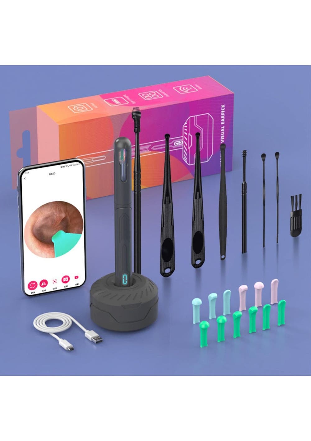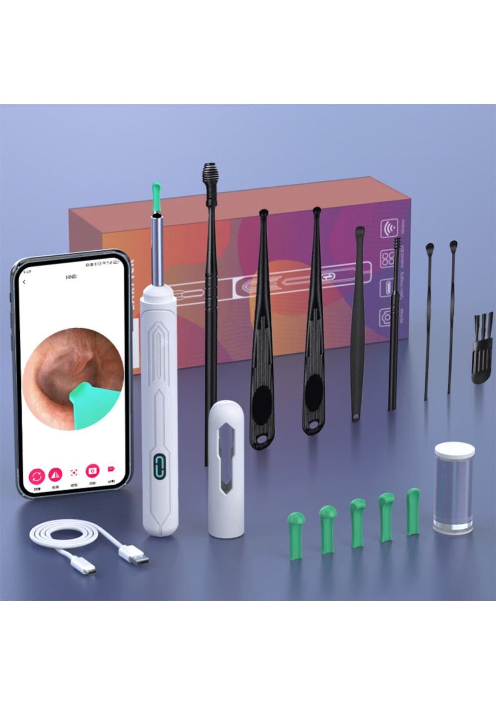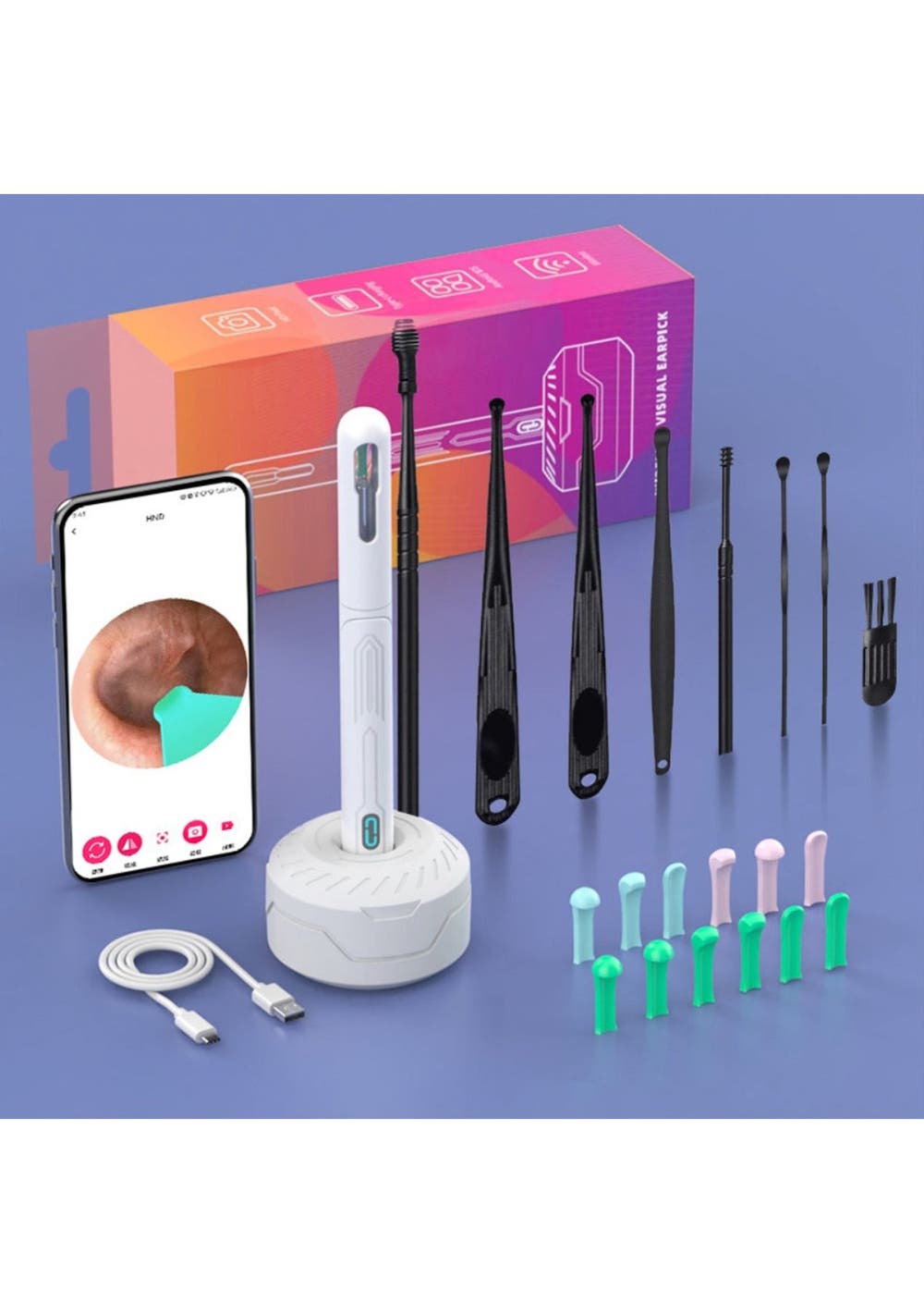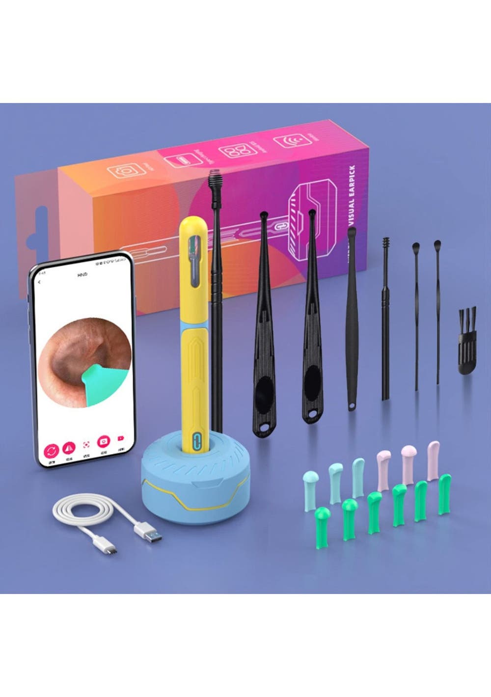 Product Description:The Smart Visual Ear Cleaner Set offers a modern and effective solution for safe and efficient ear cleaning. With a wireless otoscope, USB C charging, and a mini camera, it eliminates the need for traditional ear cleaning methods, ensuring precise and comfortable use for all members of the family. Its advanced design allows you to clean your ears with confidence, replacing outdated tools with high-tech functionality.This set features the upgraded NK3 Wireless Otoscope, fully compliant with FCC, RoHS, and CE standards. Its harmless accessories make it suitable for all ear types, even oily ears, ensuring safe use for everyone, including pets. You can trust this tool to provide an improved ear cleaning experience, offering both comfort and accuracy.Equipped with a 360° wide-angle lens and 1296P HD image, the ear cleaner delivers clear visuals of the ear canal in real-time, allowing for precise removal of wax buildup. The high-definition imagery promotes better hygiene and health, making it easier to monitor and maintain the cleanliness of your ears.Using the Smart Visual Ear Cleaner Set is simple, thanks to its wide compatibility with Android and iOS devices. The accompanying app ensures ease of use, allowing for quick setup and real-time monitoring. In addition to ear cleaning, this versatile tool can be used for skin, nose, and teeth examinations, making it an essential home helper for maintaining the health of both family members and pets.Product Specification:Material: Soft PCColor: Orange, White, Black, Yellow, PinkSize: 15 x 5.6 cmWeight: 71 gFunction: Ear CleanerPackage Inclusion:Set 11 x Visual Ear Pick1 x Base set12 x Ear Tip Accessories1 x Charging cable1 x Package box1 x User manualSet 21 x Visual Ear Pick5 x Ear Tip Accessories1 x Charging cable1 x Package box1 x User manual