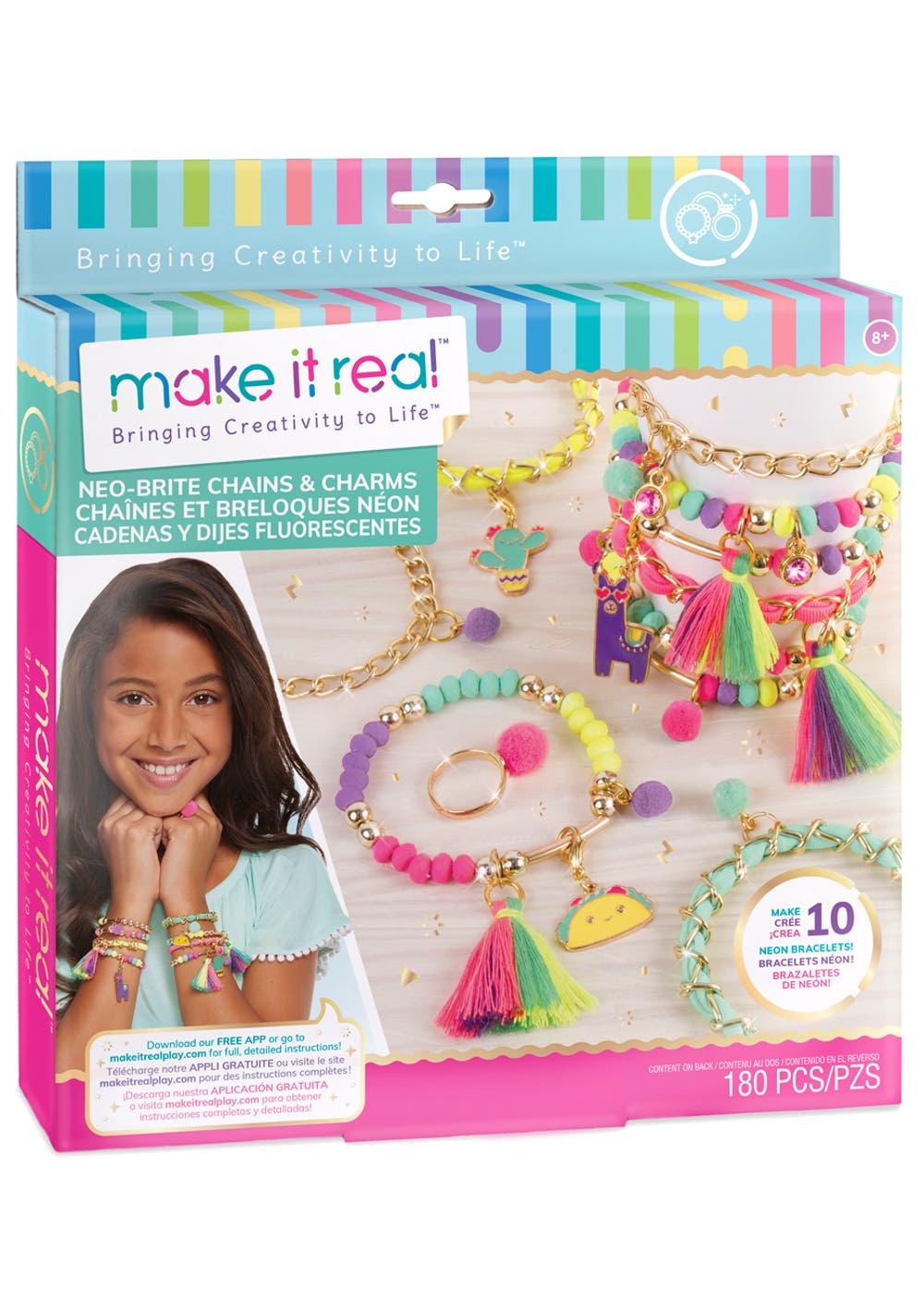 Creating 10 eye-catching neon bracelets and a textural pom-pom ring is simple with this set's easy-to-follow instructions and full suite of materials. Content: 160 various beads, 3 unique charms, 3 tassels, 6 pom pom charms, 3 gem charms, 3 colours of elastic fabric cords (1.5 m), 5 pieces of gold curb chain, 1 adjustable ring, 1 pink pom pom, clear elastic cord (2 m), instructions, Play Tray.