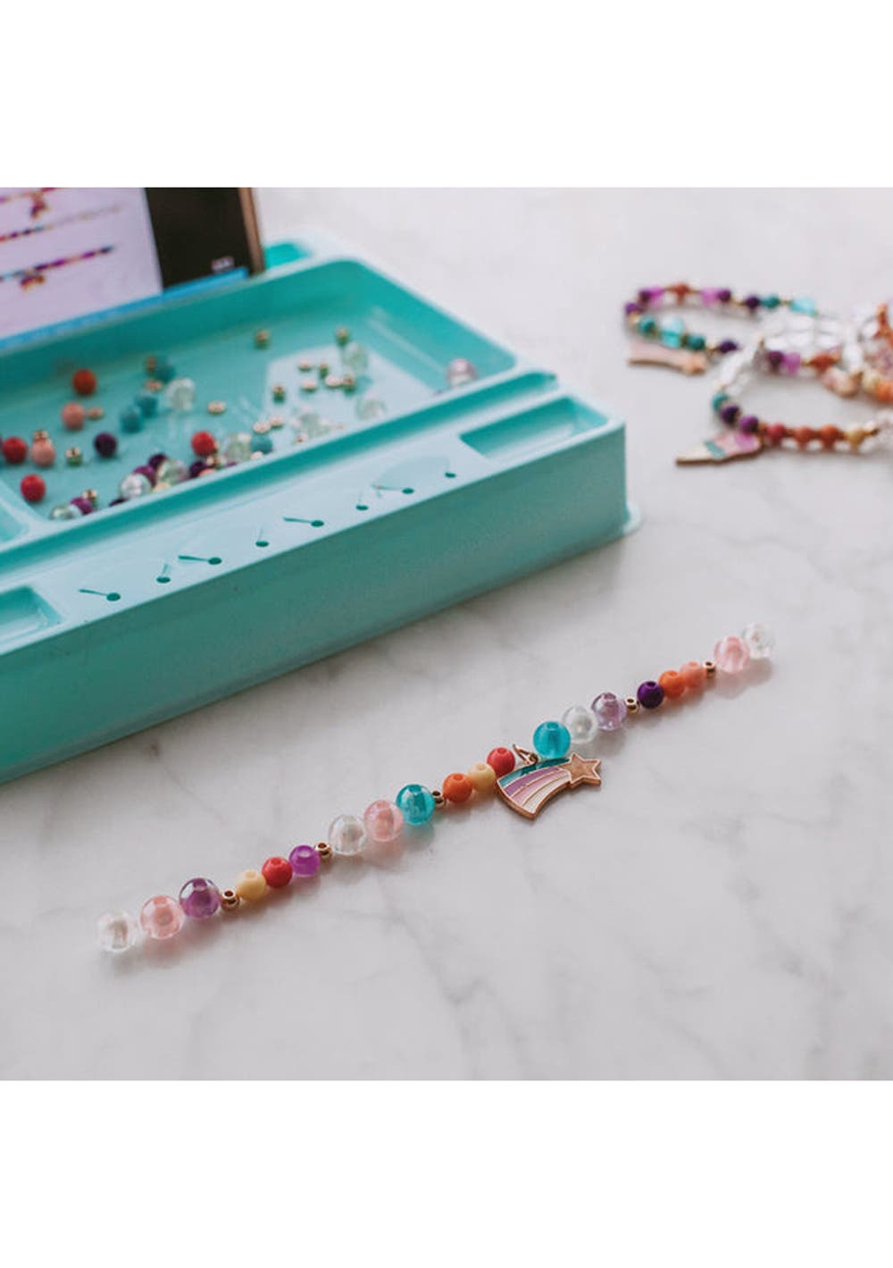 Create your own 3 unique charms bracelets. Kit contains: 70 plastics beads, 30 gold beads, 12 gold spacer beads. 3 unique charms, 1m clear elastic cord, play tray and instructions. Ages 8yrs+.
