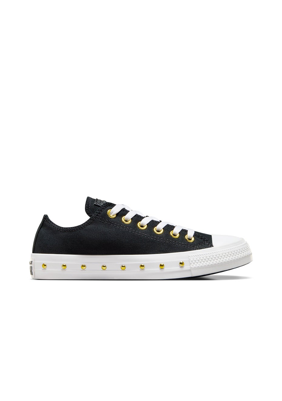 Signature Chuck Taylor style, with a little edge. The iconic low top you know and love gets a fresh look with applied golden studs. Dress 'em up, dress 'em down—all that's missing is your unique styling. Details Low-top shoe with a canvas upper OrthoLite cushioning for optimal comfort Zinc-studded accents for an added edge Golden eyelets match back to the studs Iconic All Star license plate Chuck Taylor All Star Origins Created in 1917 as a non-skid basketball shoe, the All Star was originally promoted for its superior court performance by basketball mastermind Chuck Taylor. But over the decades, something incredible happened: The sneaker, with its timeless silhouette and unmistakable ankle patch, was organically adopted by rebels, artists, musicians, dreamers, thinkers and originals.