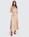 Elegantly stunning, the Lover To Lover Maxi Shirt Dress follows the classic military style in a silk-like fabric. With long sleeves and hemline, the high slits make an even bolder statement than the ornate metal buttons.