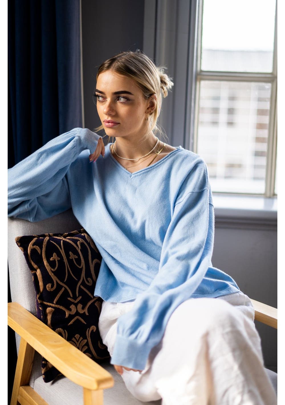 100% Merino Introducing Joan, a timeless piece made from 100% Merino wool. With a relaxed v-neck, dropped shoulders, and pretty bell sleeves, Joan is a flattering and versatile addition to any wardrobe. The shaped side seam skims the body, creating a flattering silhouette that goes with anything. Our Merino knitwear is made from the softest Merino wool, renowned for its softness, warmth, and breathability, making it the perfect choice for you At Ohae, we take pride in the quality of our knitwear, which is designed to last season after season. Our Merino wool is ethically sourced and sustainably produced, ensuring that our knitwear is not only beautiful but also environmentally friendly. Comes in 2 colours: Ice Blue and Black SIZING: Half chest small 54cm, medium 56cm, large 58cm Total length from highest point 58cm small, 59cm medium, 60cm large Sleeve length 59cm small, 60cm medium, 61cm large