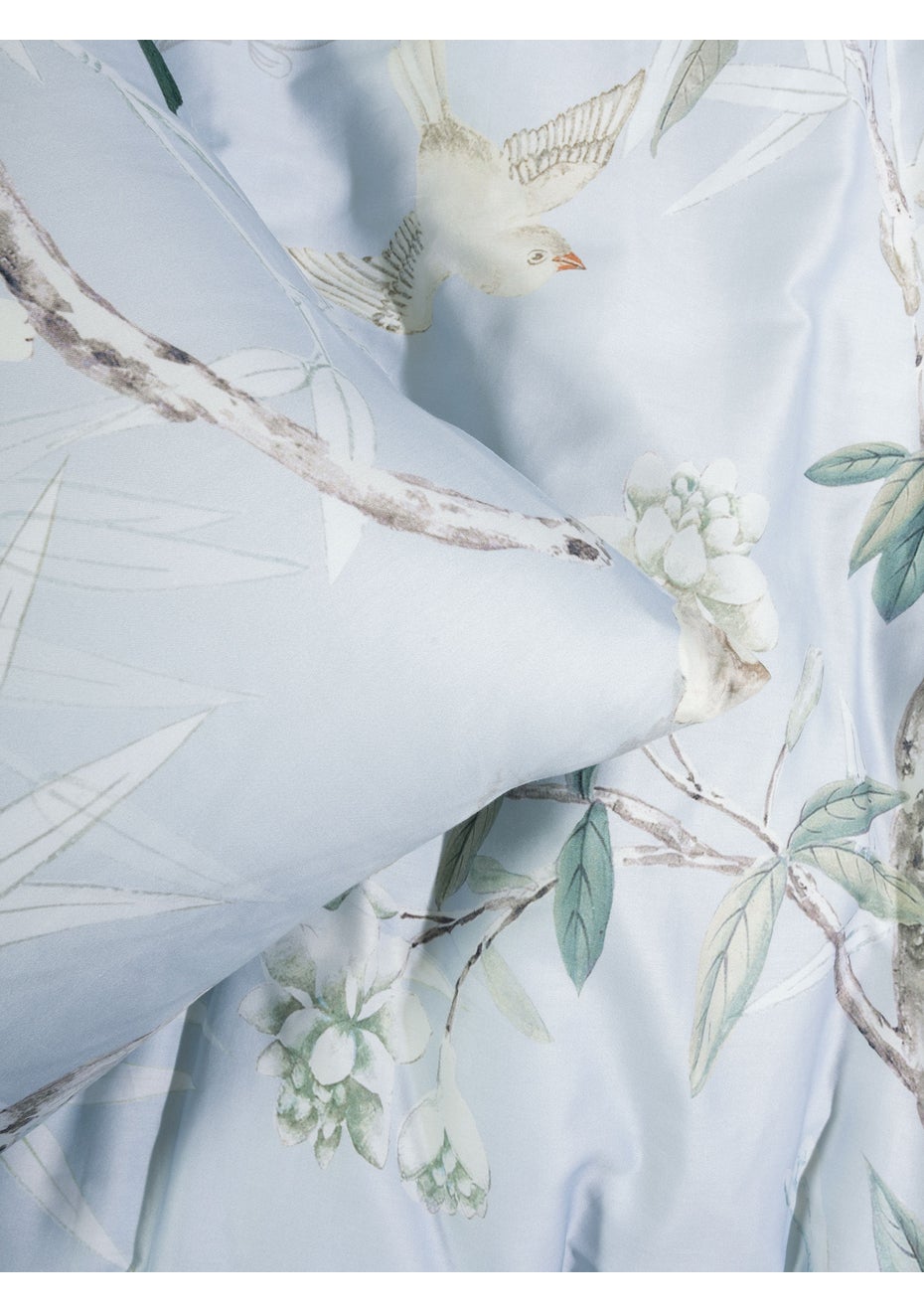 Indulge in the timeless beauty of vintage foliage with Anika. Perched amongst intricate hand-drawn greenery, charming birds find their home. Printed on lush cotton sateen, this design features a serene palette of greens and vanilla on a powder blue ground. Complete with the matching European pillowcase to enhance the atmosphere of elegance and tranquillity.