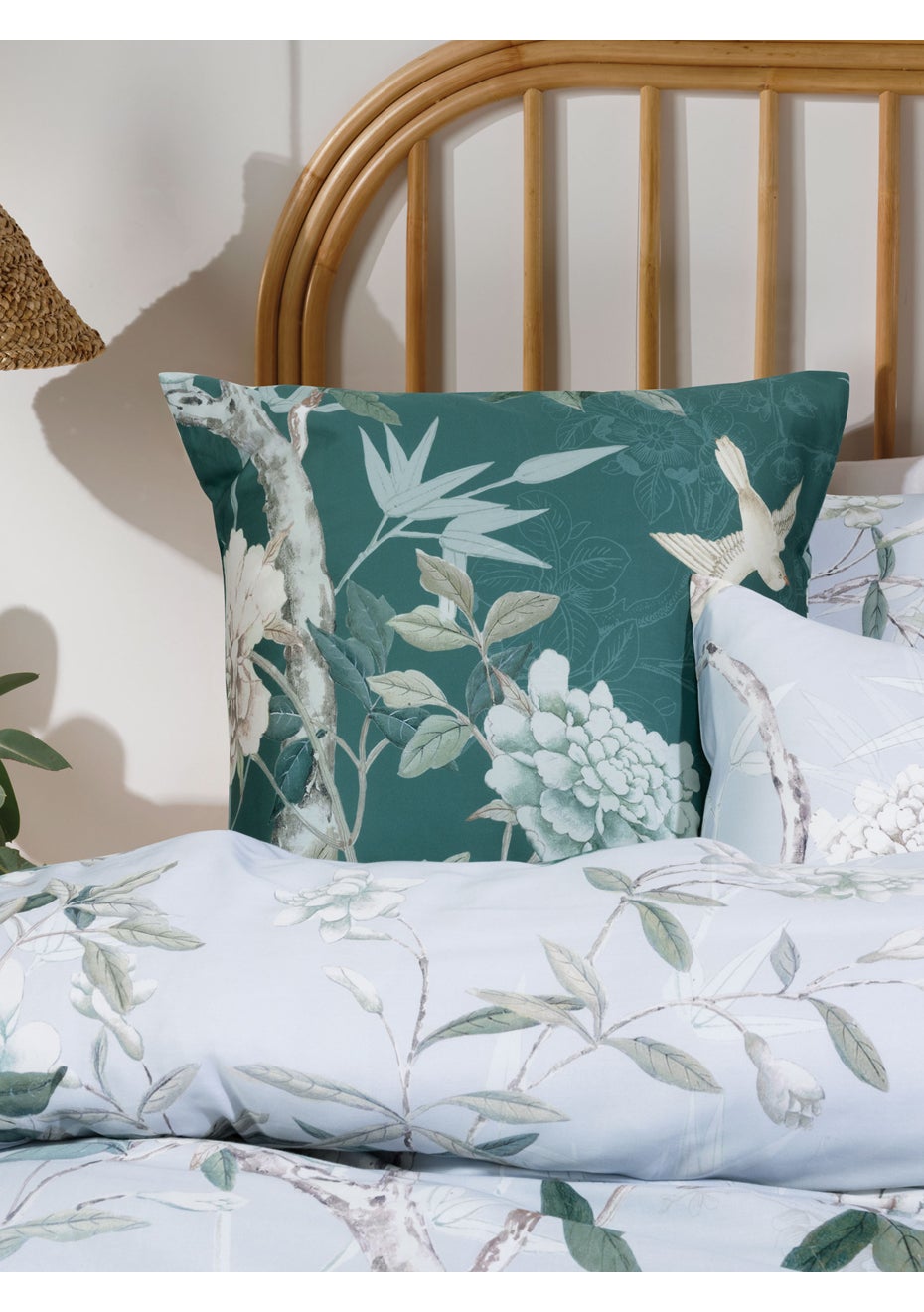 Indulge in the timeless beauty of vintage foliage with Anika. Perched amongst intricate hand-drawn greenery, charming birds find their home. Printed on lush cotton sateen, this design features a serene palette of greens and vanilla on a powder blue ground. Complete with the matching European pillowcase to enhance the atmosphere of elegance and tranquillity.