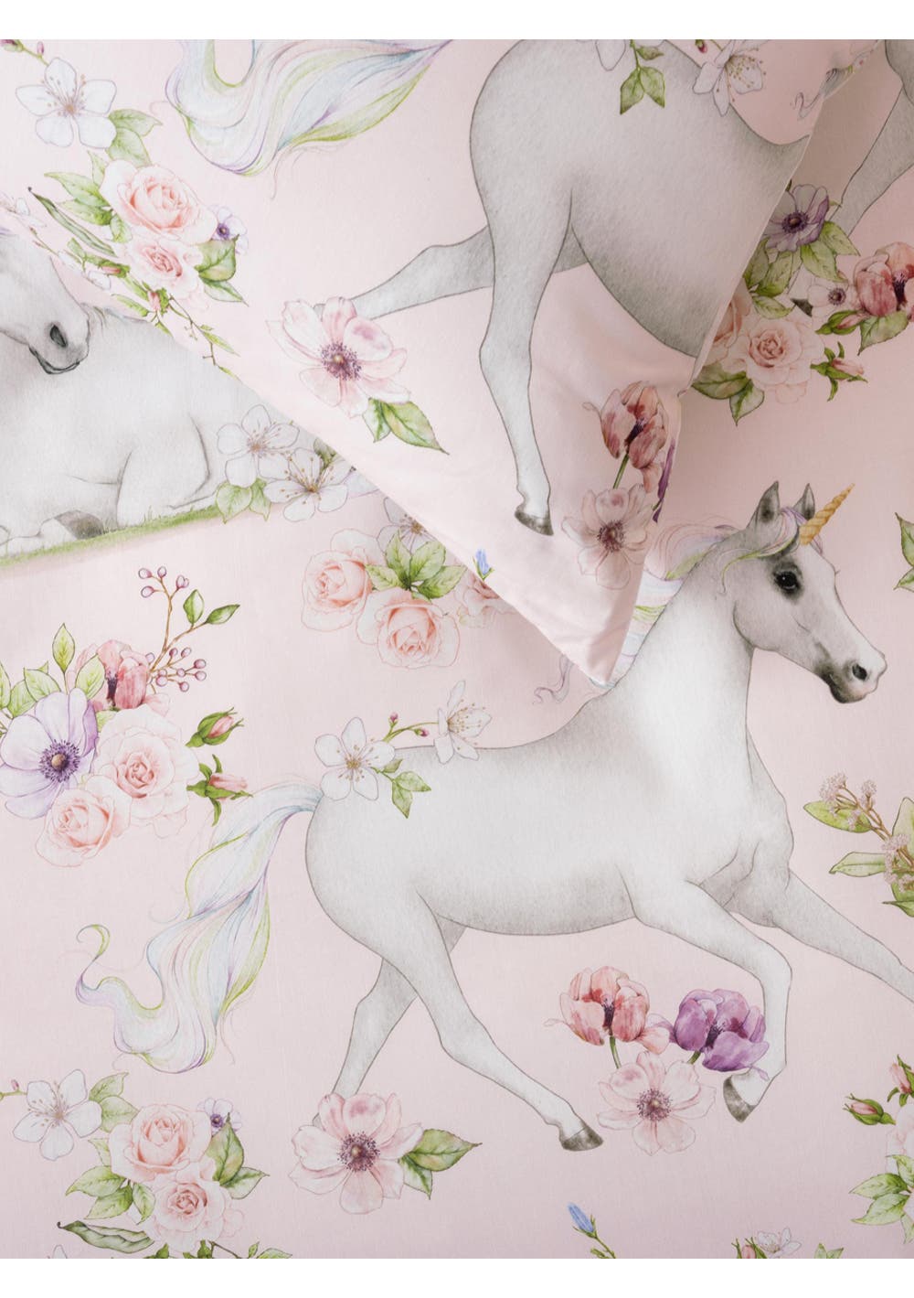 Drift off to a magical realm with Unicorn Blossom. Enchanting unicorns flaunt their vibrant rainbow manes, dancing across a dreamy blush pink background adorned with a blossoming fantasy garden. Printed on 100% cotton, this design reverses to a sweet matching rainbow and is the perfect match for the co-ordinating Rainbow Magic fitted sheet set (sold separately).