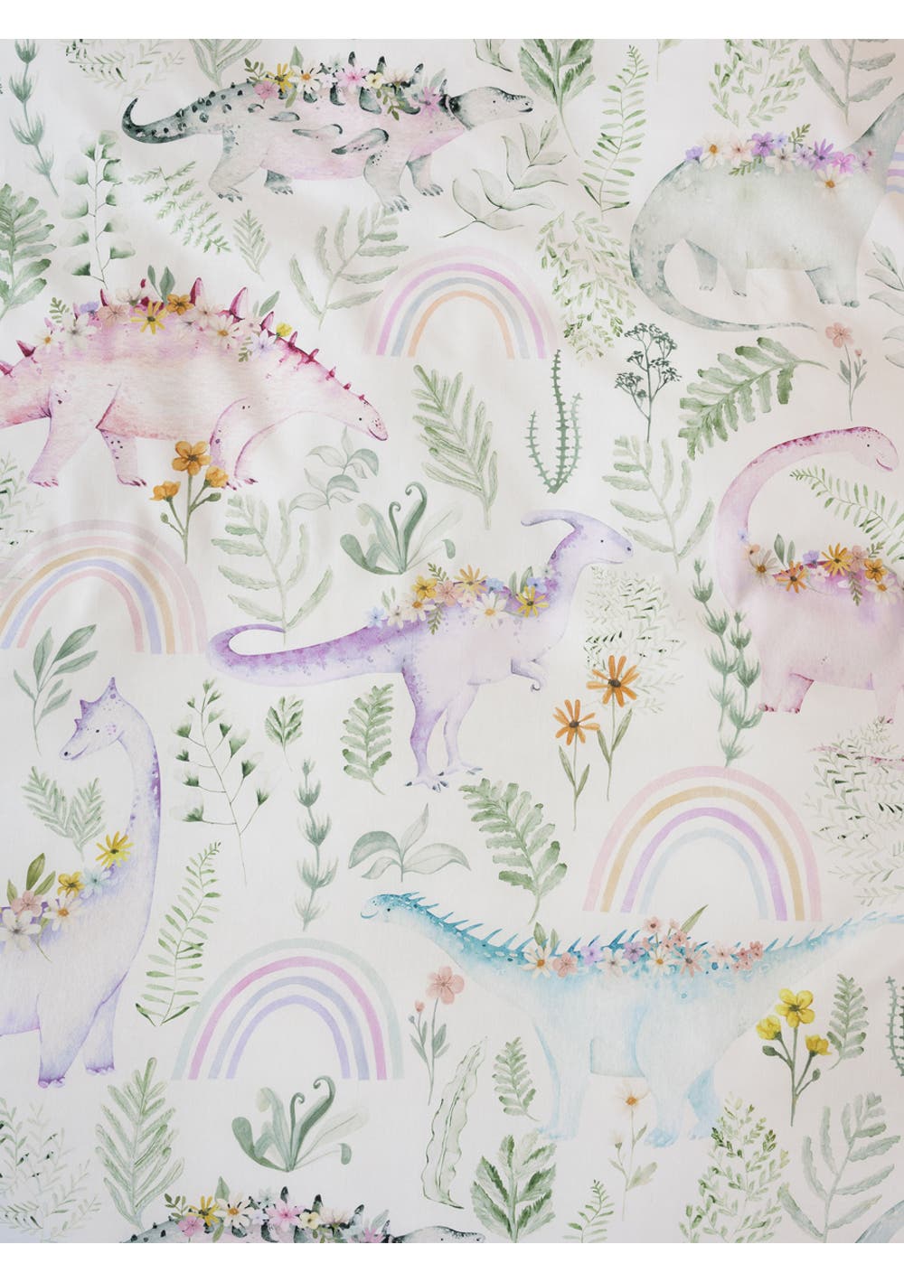 Your little palaeontologist will be delighted to slip away to a dreamscape filled with prehistoric magic. Dino Garden features charming pastel dinosaurs dressed in blossoms, roaming through lush ferns and vibrant rainbows. Printed on 100% cotton, this design reverses to a sweet matching rainbow and is the perfect match for the co-ordinating Rainbow Magic fitted sheet set (sold separately).