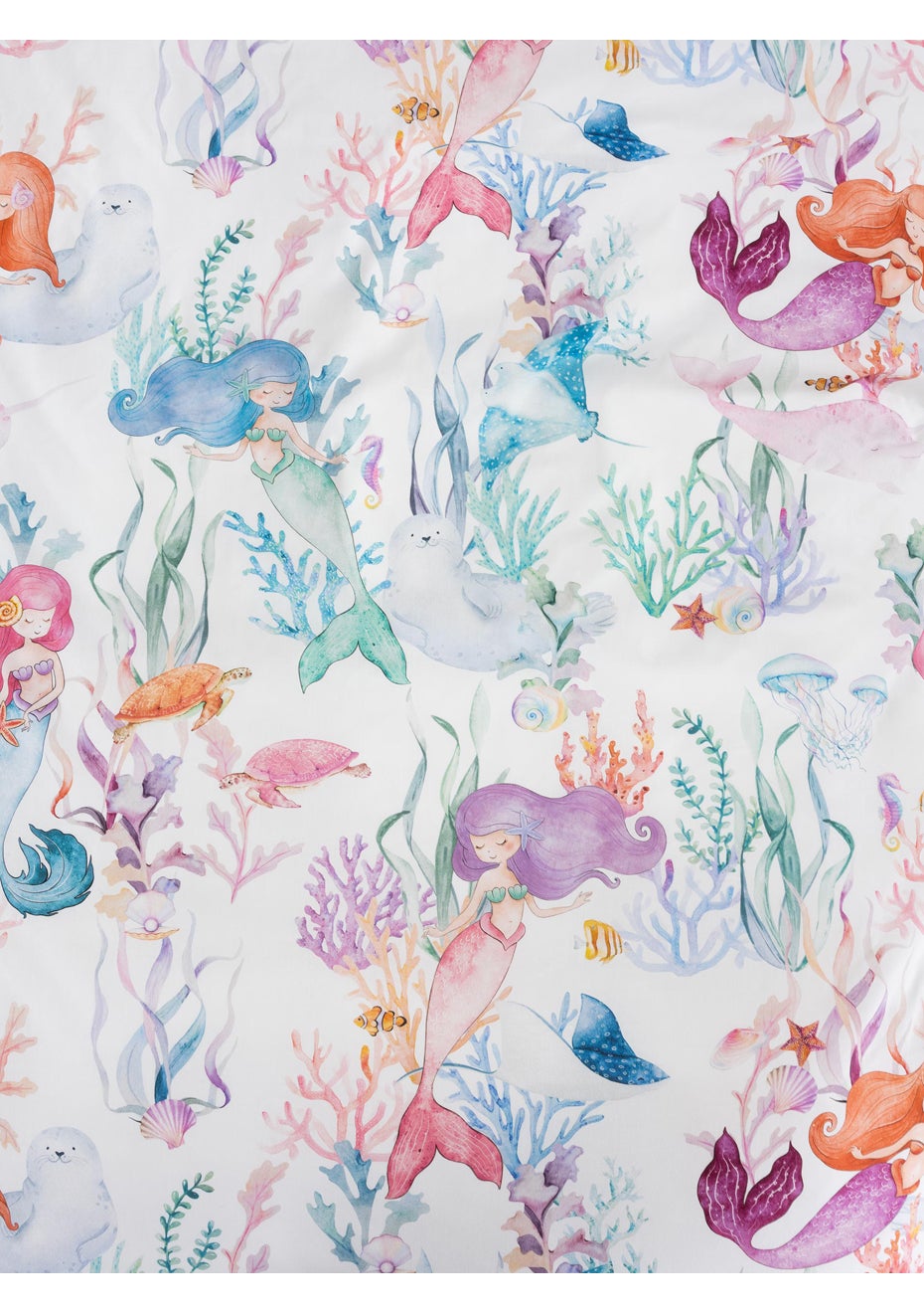 Dive into the enchanting depths of Mermaid Lagoon! Colourful mermaids gracefully swim through a watercolour scene filled with lively coral reefs and their friendly ocean pals, including turtles, seals and more. Printed on 100% cotton, this design reverses to a classic lilac gingham and is the perfect match for the co-ordinating Jagger Lilac fitted sheet set (sold separately).