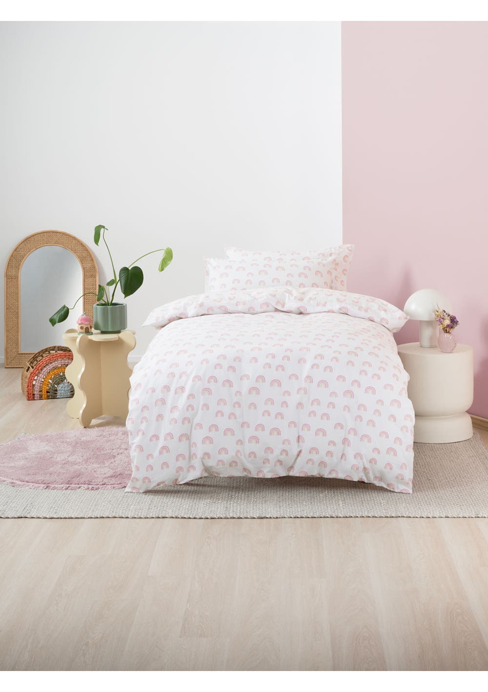 Feel enchanted with the Rainbow Magic duvet cover set. This delightful design features an array of whimsical, painterly rainbows in a muted palette of pinks and sand against a soft white background. Printed on 100% cotton, this design is the perfect match to the Squiggles Rainbow Magic sheeting.