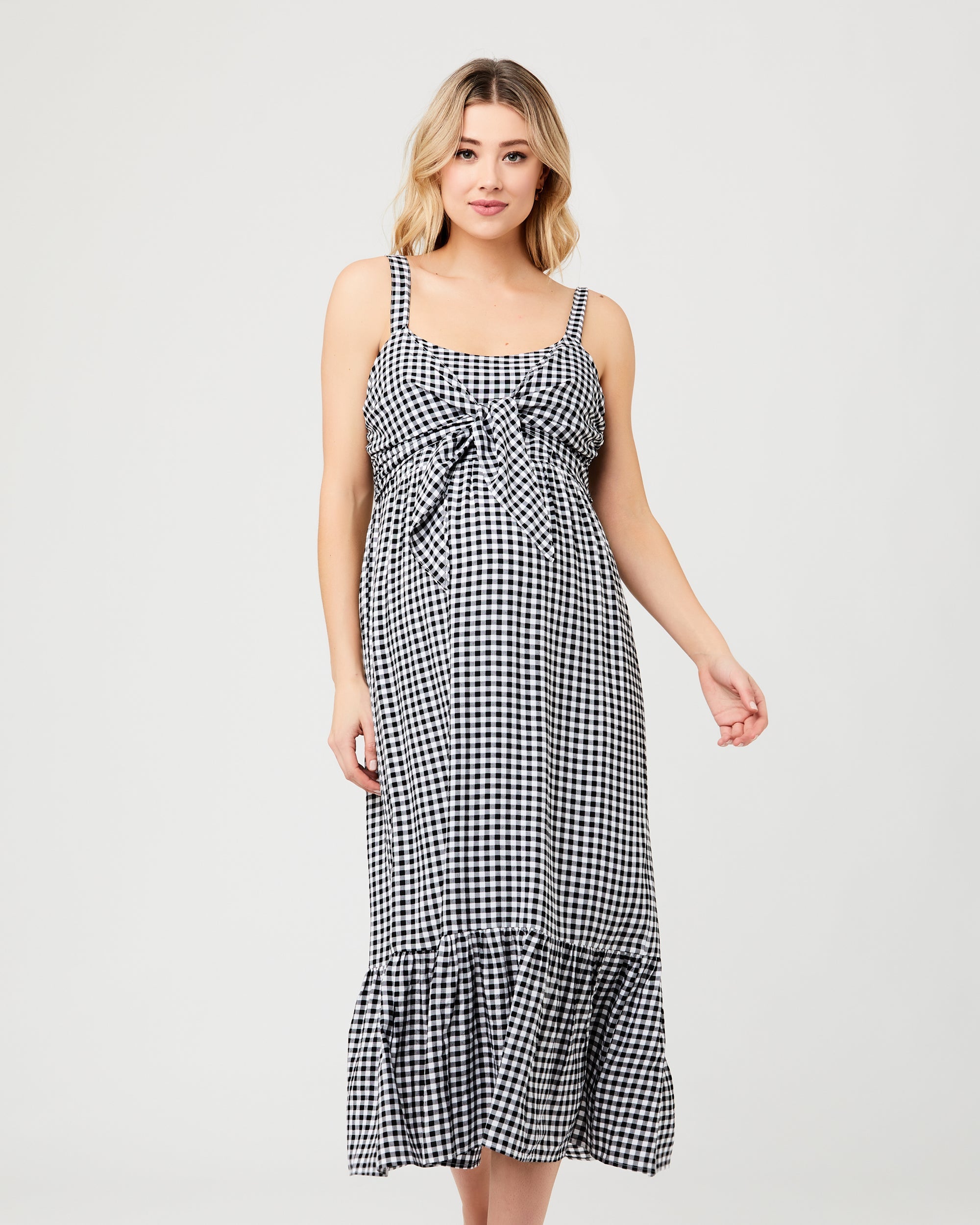 Every wardrobe needs a highlight piece that instantly makes you feel fun and stylish whenever you put it on. Our gingham nursing dress is just that and more! Featuring tie up straps and a ruffle trim maxi skirt, this dress is also feeding friendly thanks to the tie-up front that opens to expose an invisible zip for easy nursing access.
