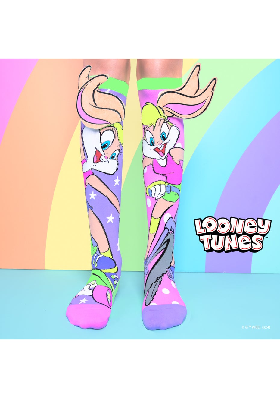 Ride into action with our Lola Bunny Socks featuring plush 3D silk printed ears bringing this classic cartoon character to life! Glide on a bicycle with Lola on one sock, and kickflip into fun with her on a skateboard on the other. Wrapped in a hug of pastel hues and twinkling stars, these socks are your ticket to nostalgic fun, wherever you go! Kids and Adults Socks Size Our most popular size. These socks are 'one size fits most' and are suitable for ages 6 - 99. They can fit adults but we recommend up to shoe size EU 41 equivalent to women's size 8/9 AU. Please note, they do have limited stretc
