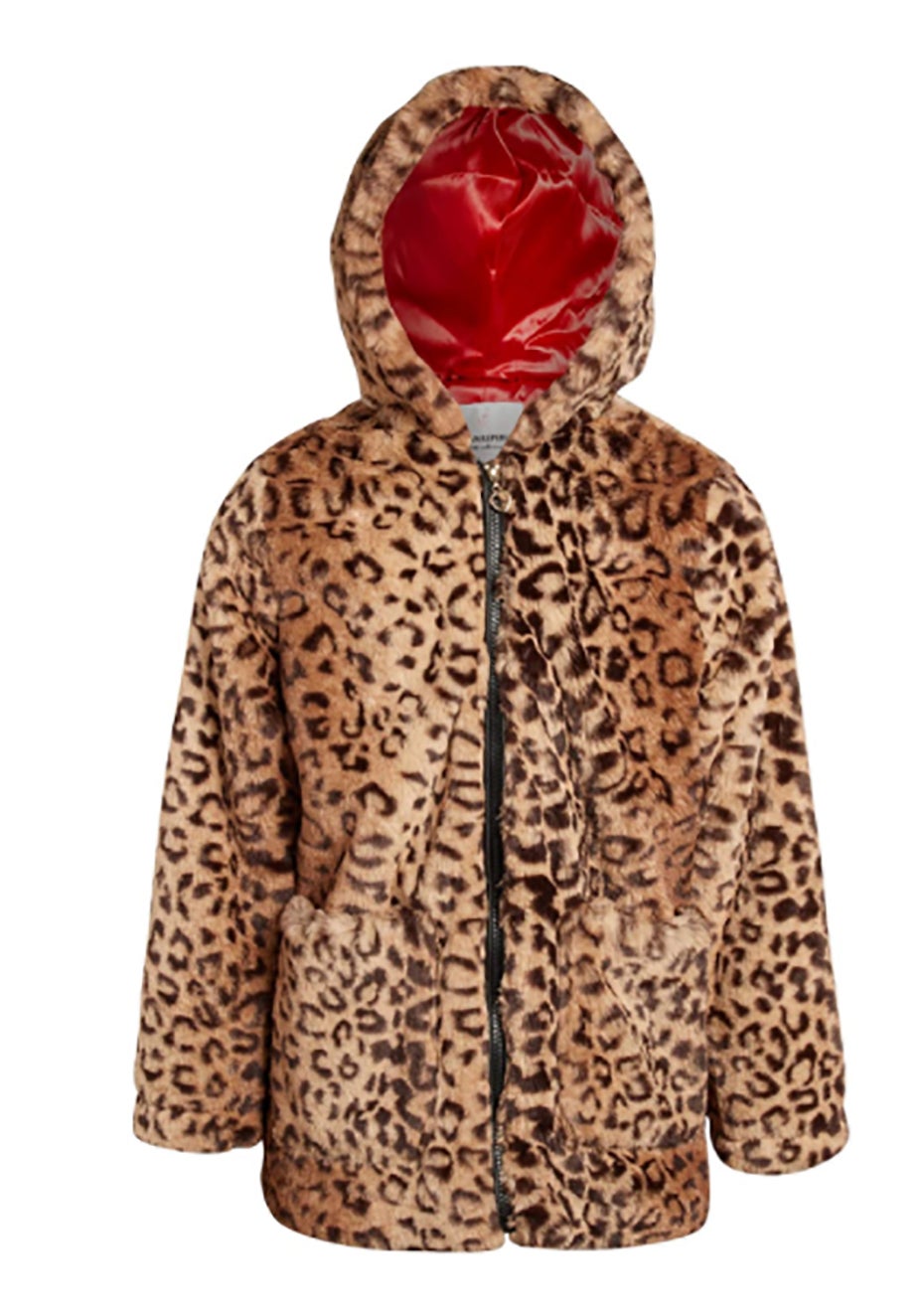 A hooded faux fur jacket will ensure she stays stylish and toasty. Attached hood. Long sleeves. Two front pockets Zip front closure. Faux fur