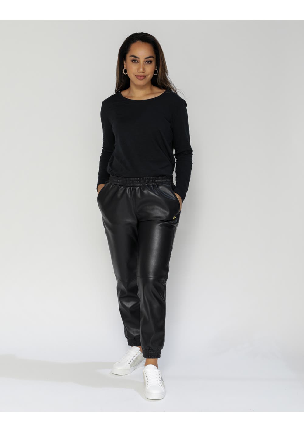 Black colour Gold S+G logo on the pocket Jogger style pants Faux leather style Elasticated waistband Pockets Elasticated cuffs on the ankles Full-length