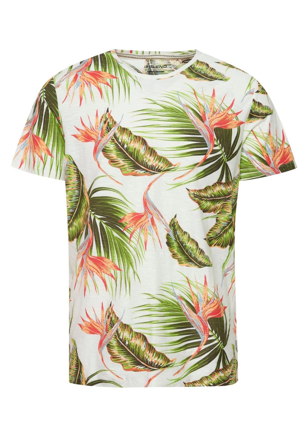 Blend jungle print crew neck tee, comfortable and casual. Vibrant plant foliage pattern over a brighter Snow White base colour. Relaxed fit with a flattering shape. Perfectly paired with shorts in Dill green or Forest Night. Please note if you are in between sizes, we recommend going up a size. 100% Cotton