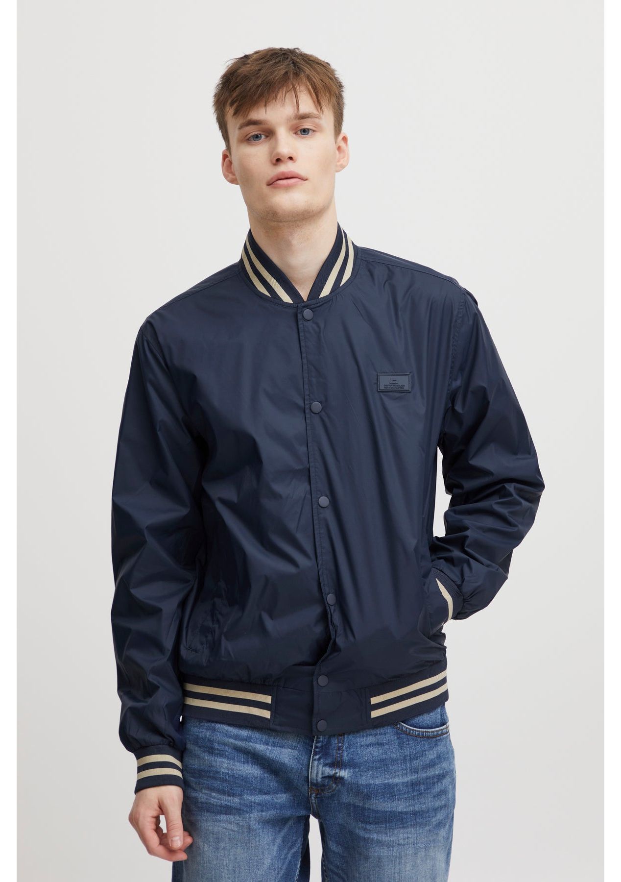 The Blend Bomber - Navy is a versatile jacket that adds a sophisticated touch to any look. It features a classic track style with a center button closure and a contrast striped rib collar, cuffs, and hem. This lightweight piece is perfect for transitioning between seasons. If you are in between sizes we recommend going up a size. For a better indication of fit please refer to the size guide in images. 100% Nylon MS23|20715743