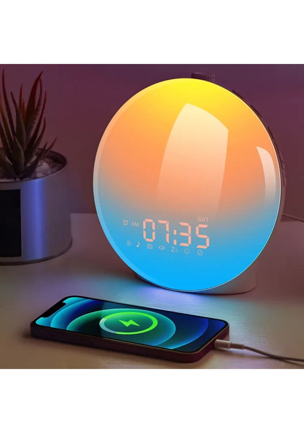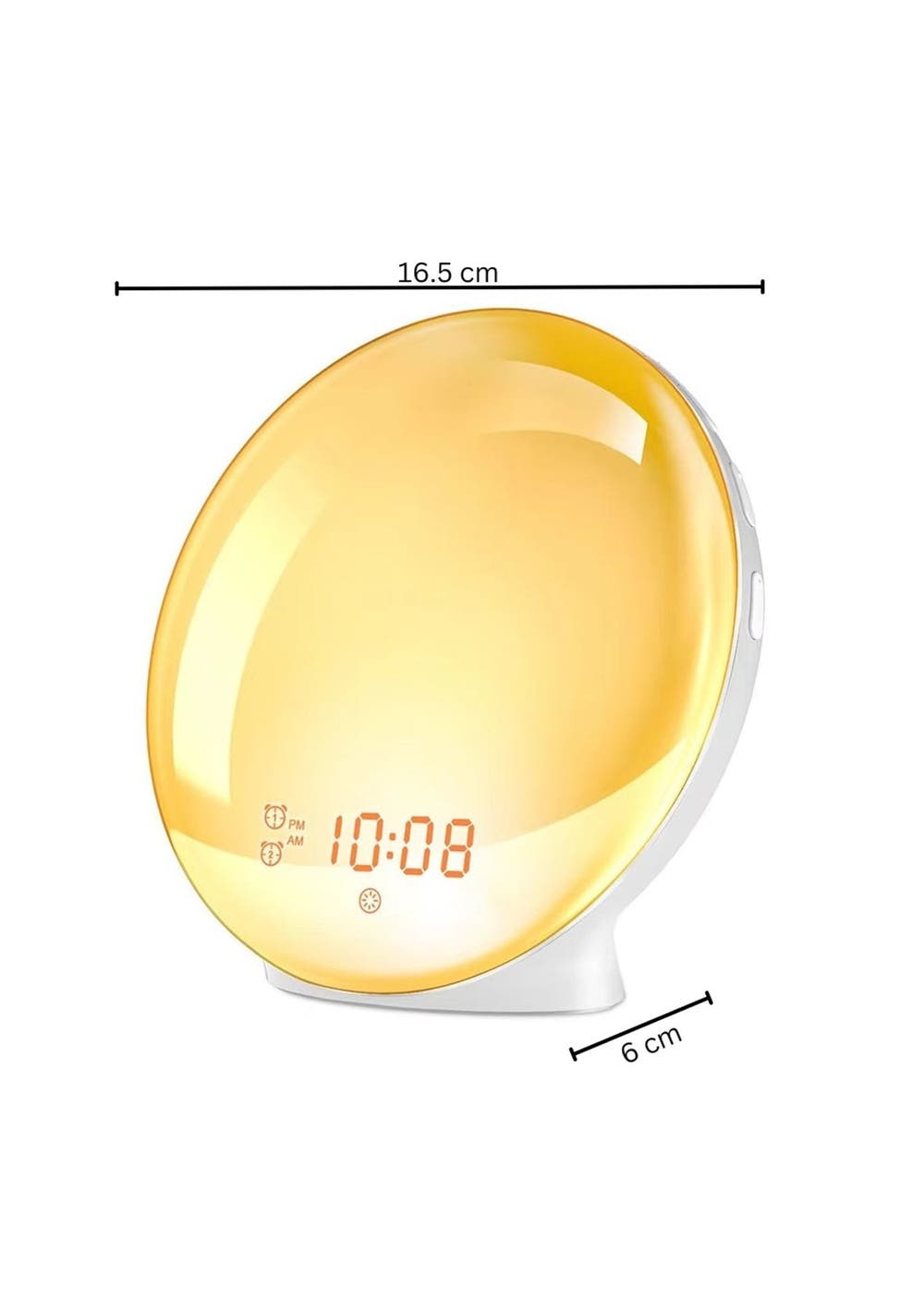 Product Description:The Wake Up Light Alarm Clock gradually simulates a sunrise with natural sounds or FM radio, gently waking you up over 30 minutes. The light starts dim and gradually brightens to help you wake up feeling refreshed. Designed for heavy sleepers and children, this clock eliminates the need for harsh alarms, creating a more natural waking experience.With dual alarm settings, you can set separate alarms for different schedules, choosing from 7 natural sounds or FM radio. The snooze function provides an extra 9 minutes of rest, repeatable up to 5 times. Ideal for families or individuals with varying routines.The sleep aid feature offers calming nature sounds or FM radio with an adjustable auto-off timer. You can also dim or turn off the LED time display for a disturbance-free night. The 7-color light and 20 brightness levels let you customize the ambiance to match your preference, promoting relaxation and better sleep.Beyond an alarm clock, it doubles as a nightlight, bedside lamp, or reading lamp with adjustable brightness. The USB charging port allows you to power your devices conveniently. Perfect for bedrooms, nurseries, or as a thoughtful gift, this multifunctional clock enhances both sleep and waking experiences.Product Specification:Material: PlasticColor: WhitePower interface Input Voltage : USB5V/2AUSB Output: 5V/1ASize: 16.5 x 16.5 x 6cmWeight: 500gFunction: Alarm ClockPackage Inclusion:1 x Wake-up Light Sunrise Alarm Clock1 x User Manual1 x USB Cable