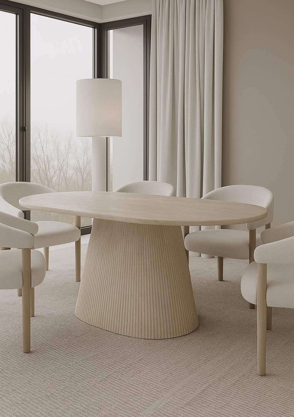 Elevate your interior with the understated elegance of our luxurious Travertine Look range. Inspired by timeless architectural forms, this statement piece features a meticulously crafted surface that mimics the natural veining and soft tonal variations of genuine travertine stone. The smooth, faux marble tabletop is gracefully supported by bold cylindrical pedestal bases adorned with vertical fluting, evoking a refined, sculptural aesthetic.